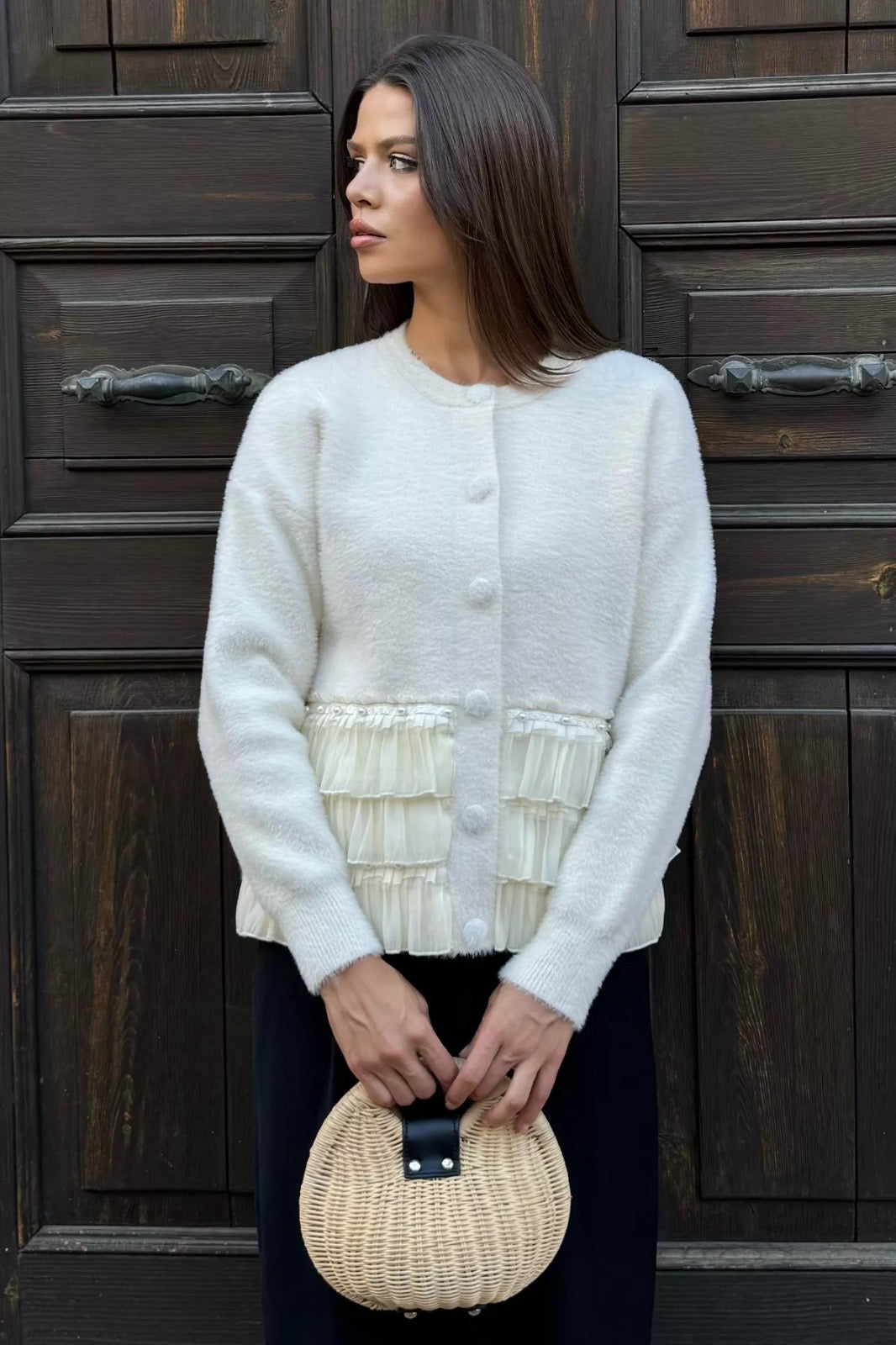 Zarif ve romantik detaylarıyla öne çıkan bu triko ceket, alt kısmındaki kat kat fırfır detayıyla feminen bir şıklık sunuyor. Yuvarlak yaka ve önden düğmeli tasarımı klasik bir görünüm sağlarken, yumuşacık dokusu sayesinde gün boyu konforlu bir kullanım imkânı tanıyor.