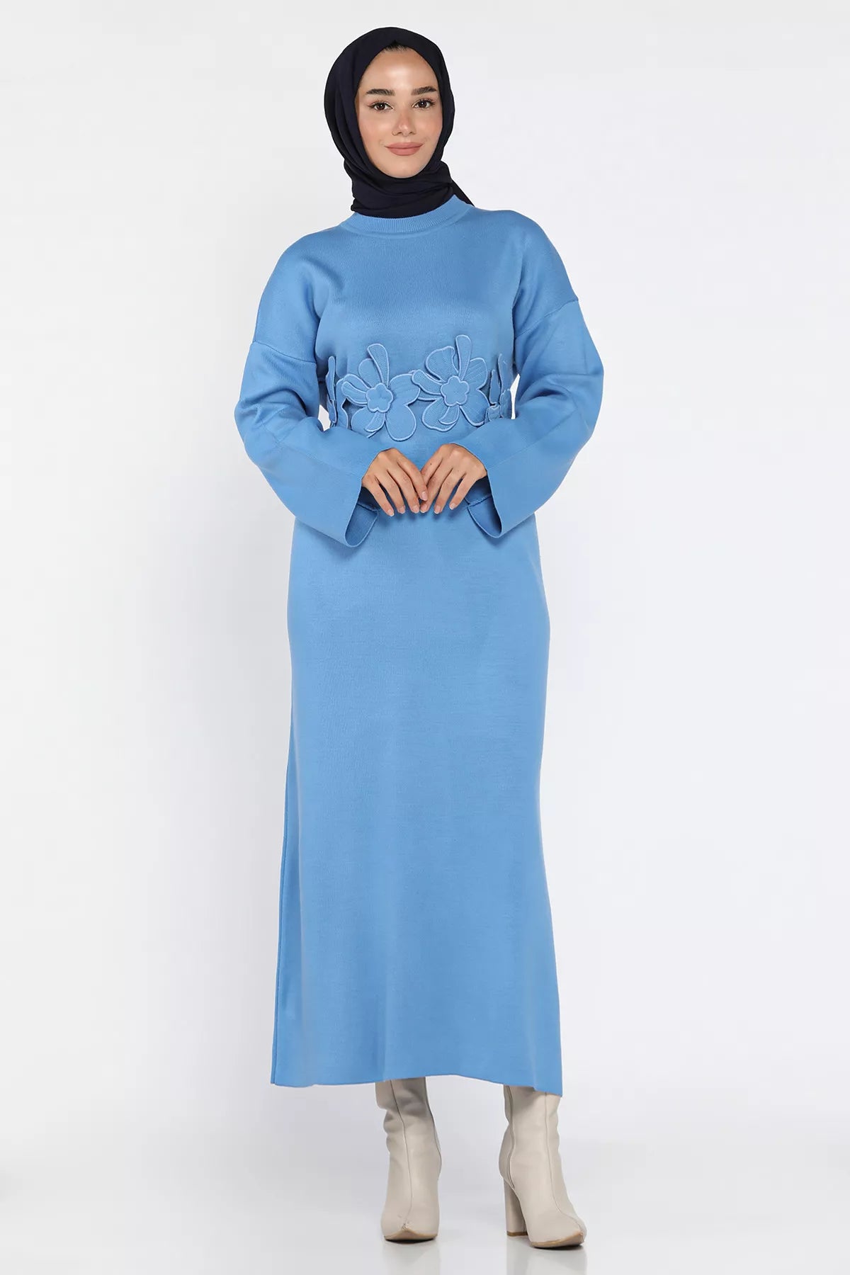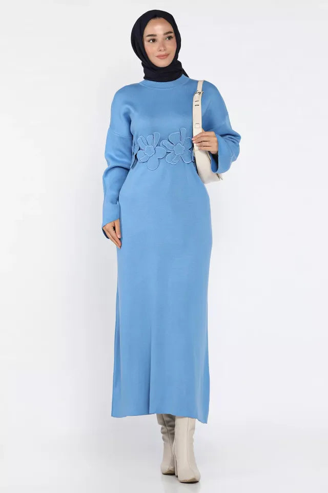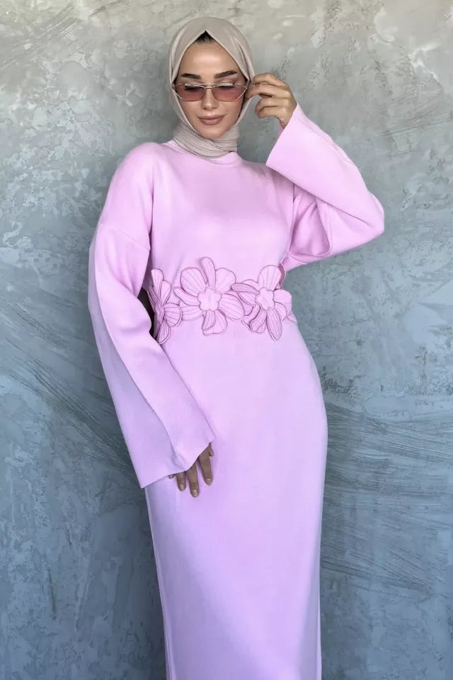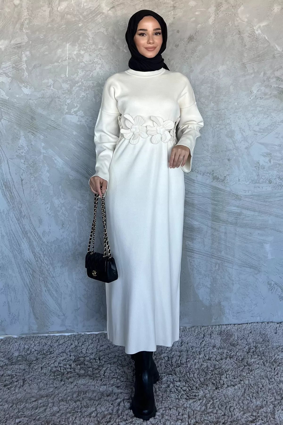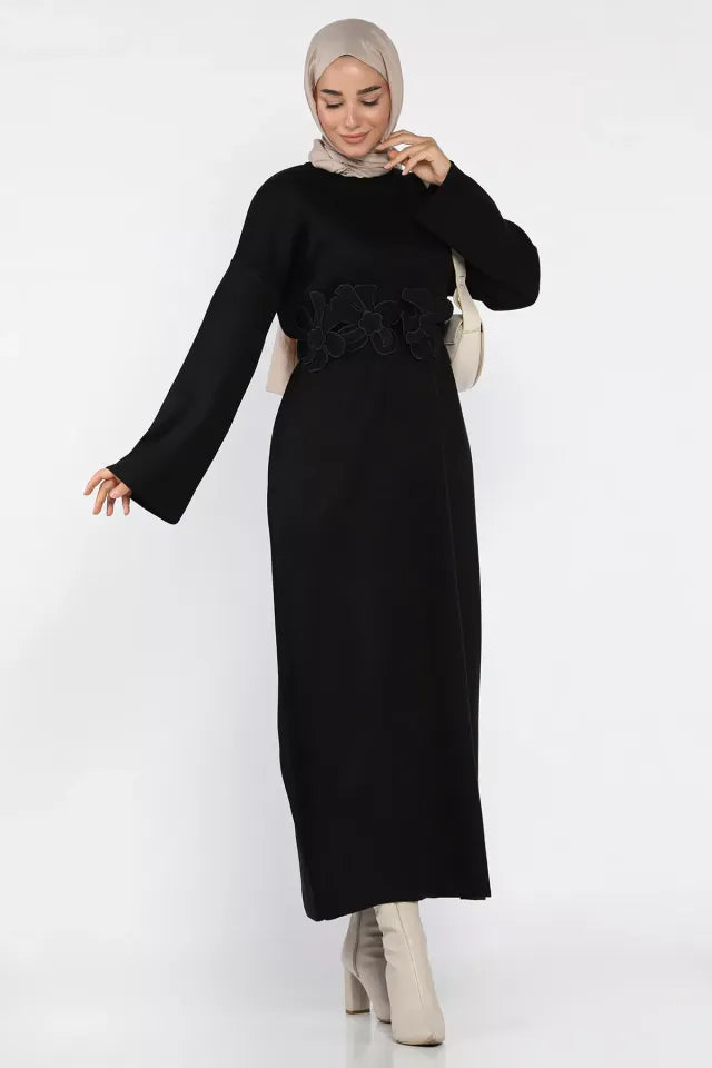Zarif detaylarıyla öne çıkan tesettür triko elbise, bel kısmında yer alan büyük çiçek figürleriyle feminen bir şıklık sunar. Bisiklet yaka tasarımı ve geniş kesim kolları modern bir siluet oluştururken uzun boyu ise elegan bir görünüm kazandırır. Minimal tasarımına eklenen çiçek detayları, elbiseyi sıradanlıktan çıkararak özgün bir stil yaratır.
