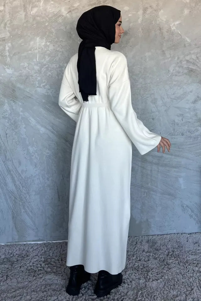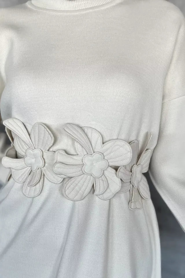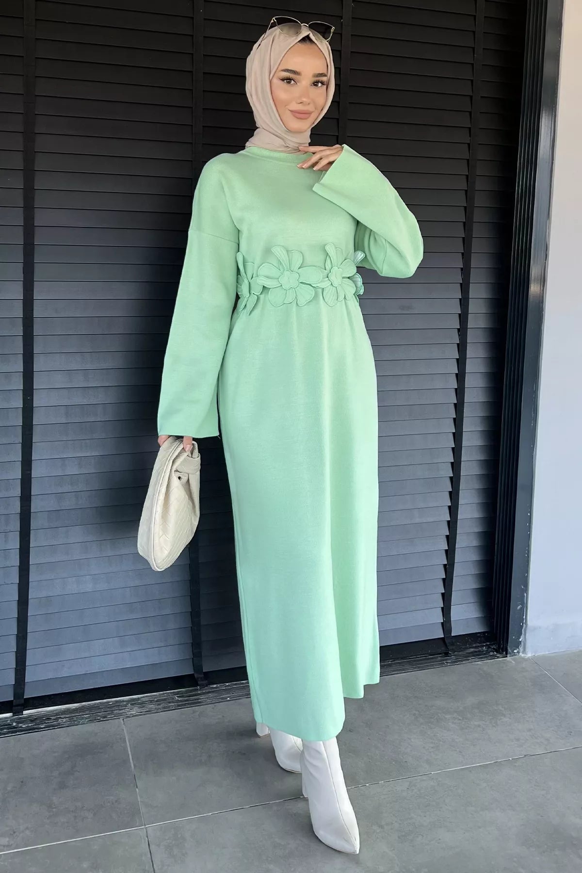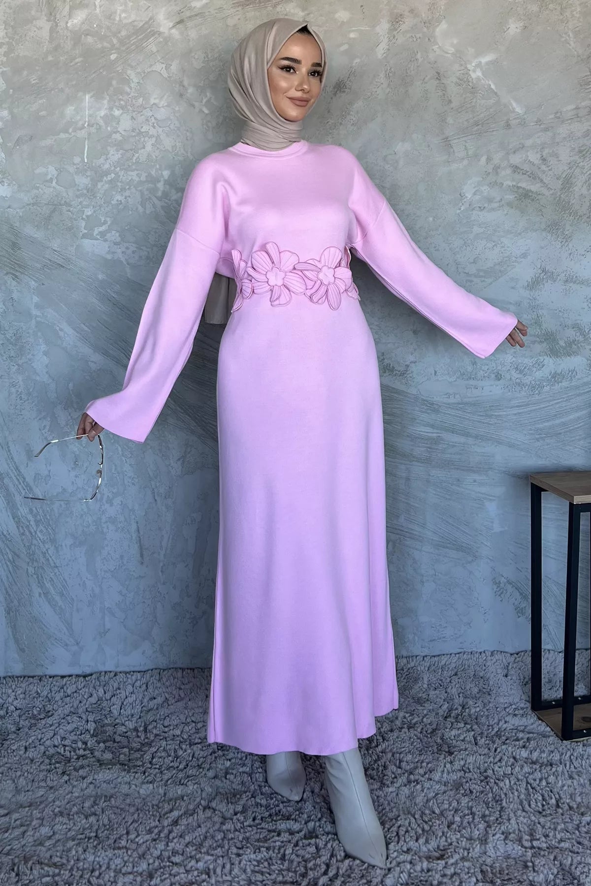 Zarif detaylarıyla öne çıkan tesettür triko elbise, bel kısmında yer alan büyük çiçek figürleriyle feminen bir şıklık sunar. Bisiklet yaka tasarımı ve geniş kesim kolları modern bir siluet oluştururken uzun boyu ise elegan bir görünüm kazandırır. Minimal tasarımına eklenen çiçek detayları, elbiseyi sıradanlıktan çıkararak özgün bir stil yaratır.