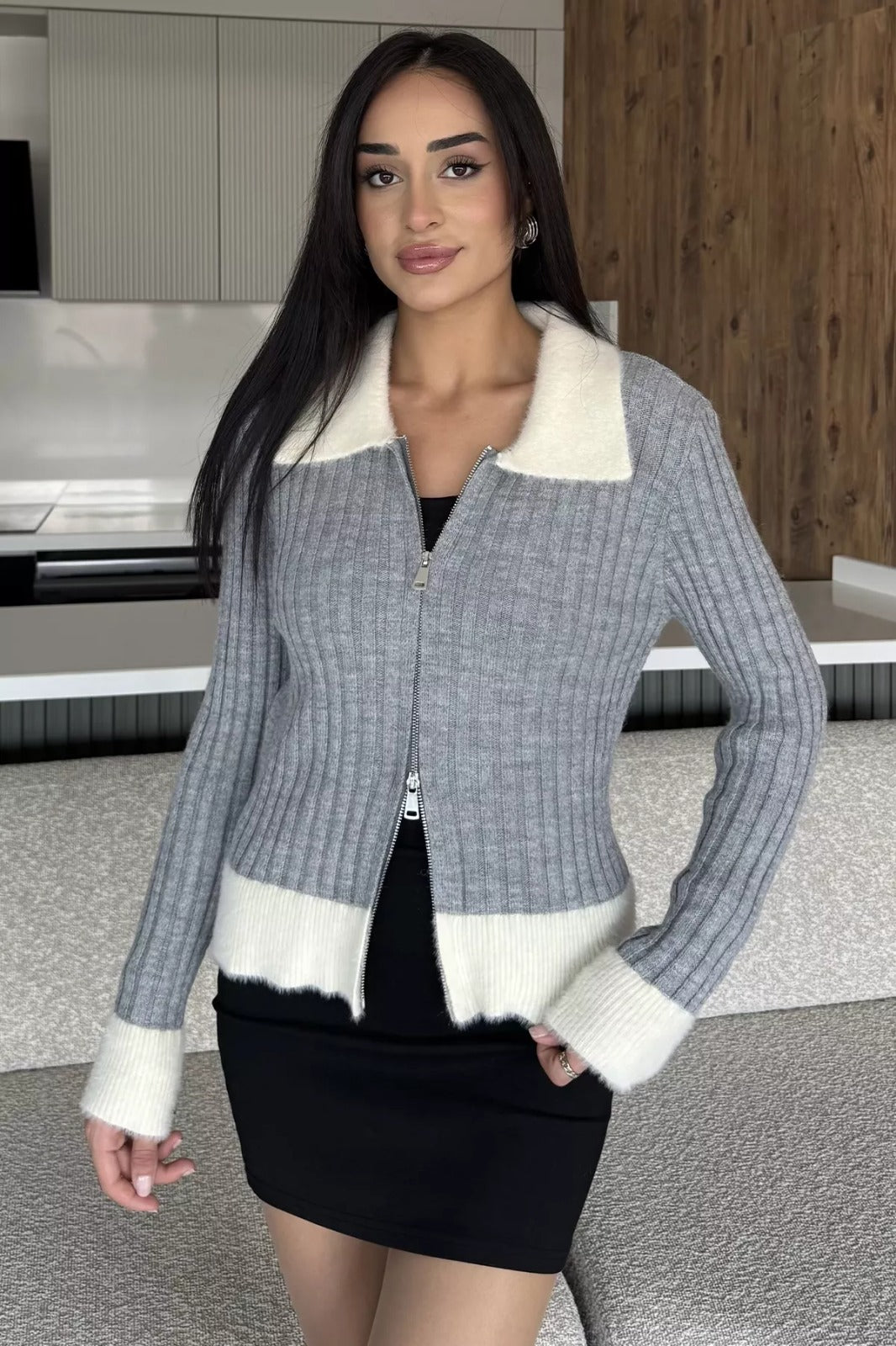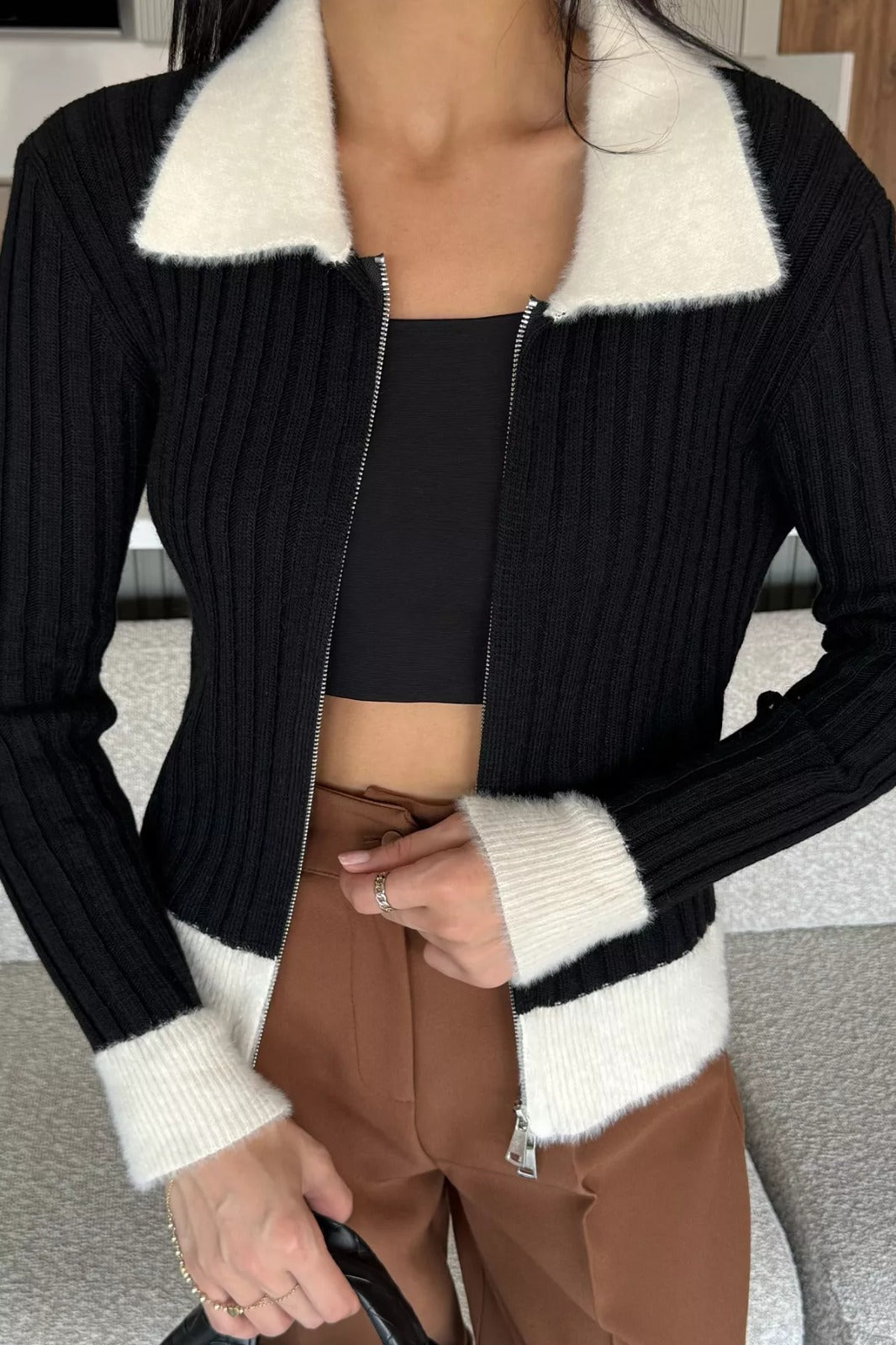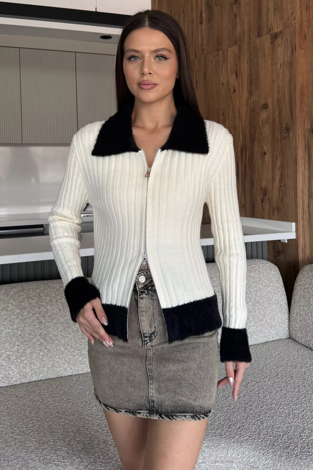 Gömlek yaka fermuarlı triko hırka, klasik ve modern detayların buluştuğu zarif bir tasarıma sahiptir. Fermuarlı ön kısmı sayesinde hem pratik hem de şık bir kullanım imkânı sunar. Gömlek yaka detayı, hırkaya sofistike bir hava katarak günlük kombinlerden ofis şıklığına kadar geniş bir kullanım alanı sağlar.