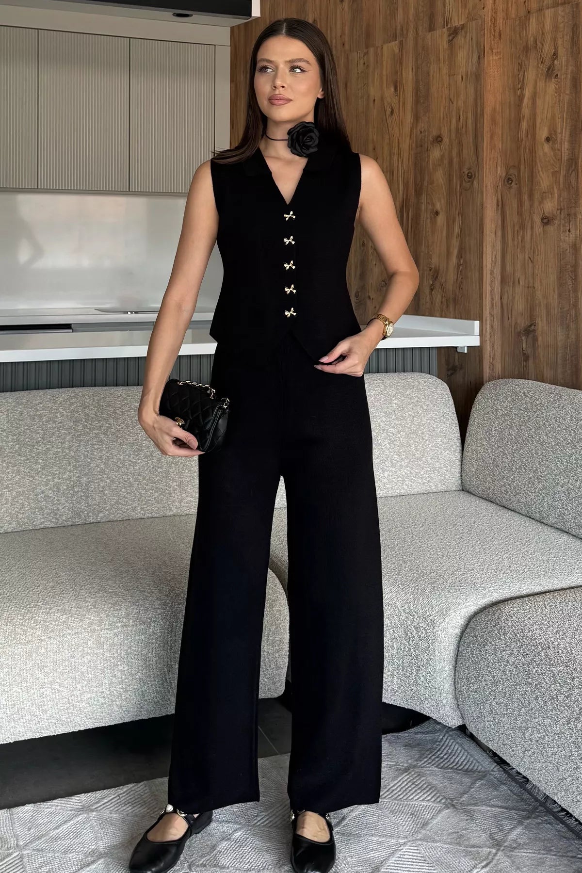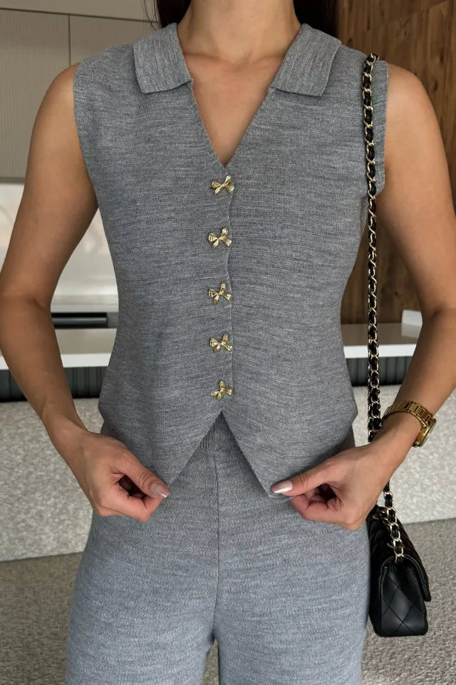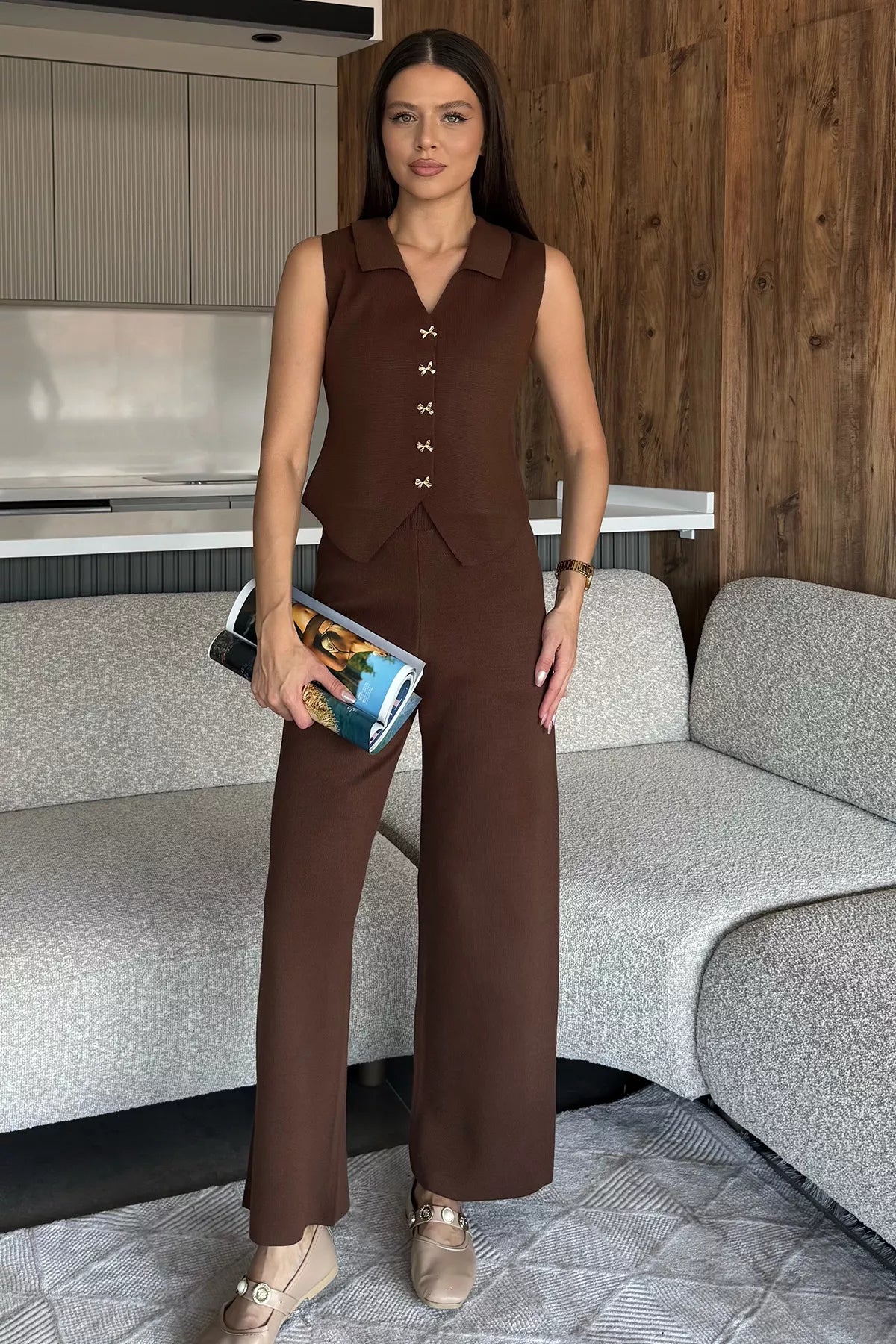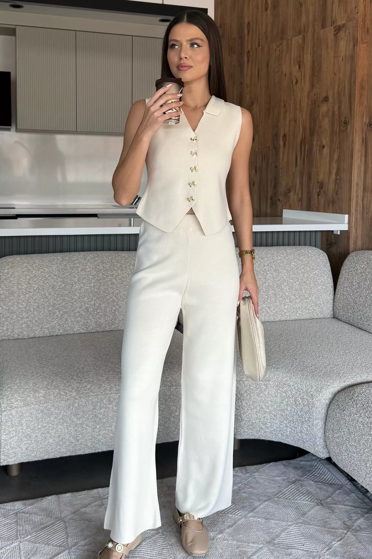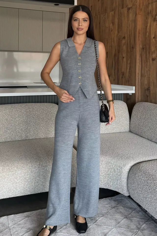 Modern tasarımıyla dikkat çeken gömlek yaka yelek pantolon triko ikili takım, şıklığı ve rahatlığı bir arada sunuyor. Yelek formundaki üst parça, zarif gömlek yaka detayı ve düğmeli tasarımıyla klasik bir görünüm kazandırırken, bel kısmındaki kesim sayesinde vücuda uyum sağlayarak zarif bir siluet oluşturuyor. Kolsuz yapısı, modern ve özgür bir tarz isteyenler için ideal bir seçenek sunuyor.