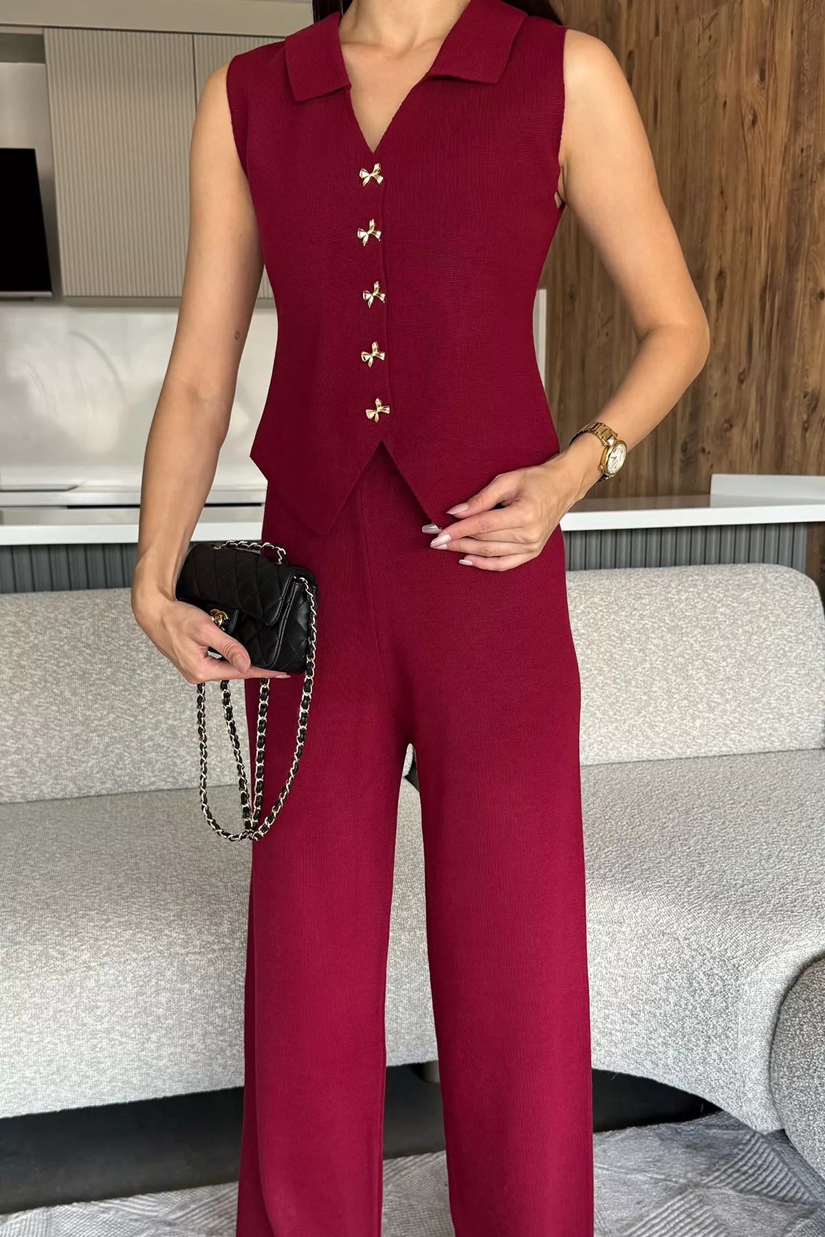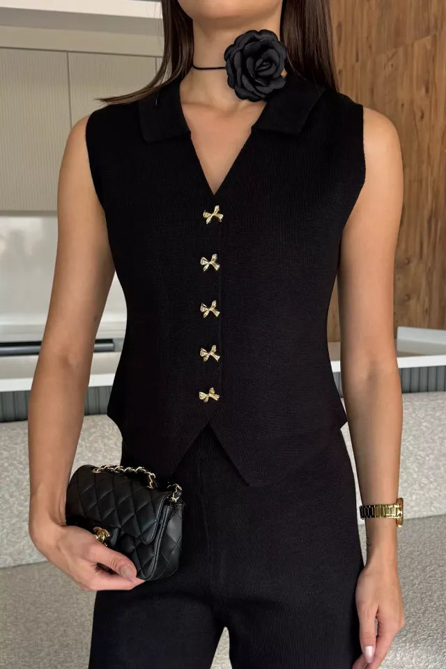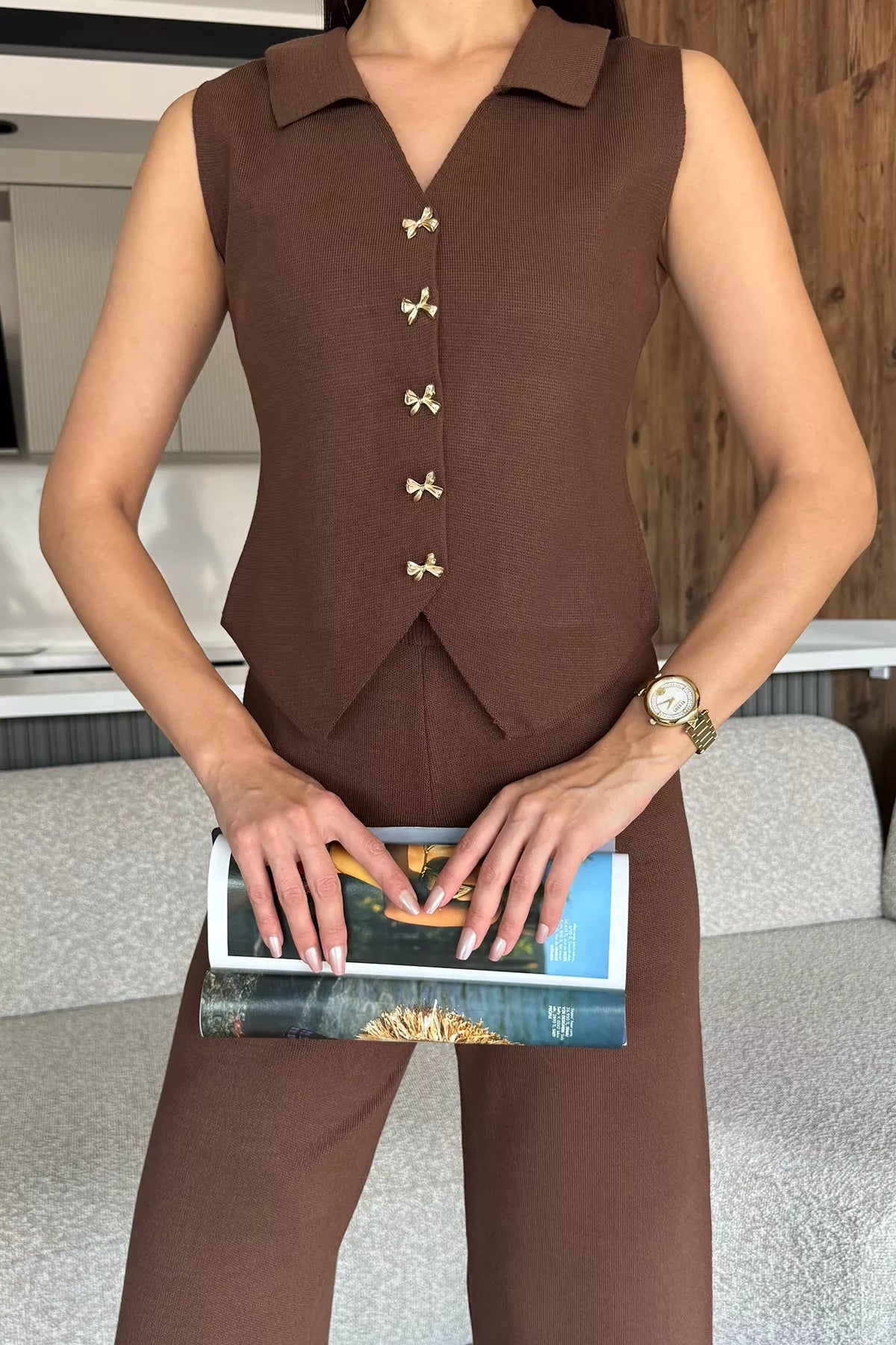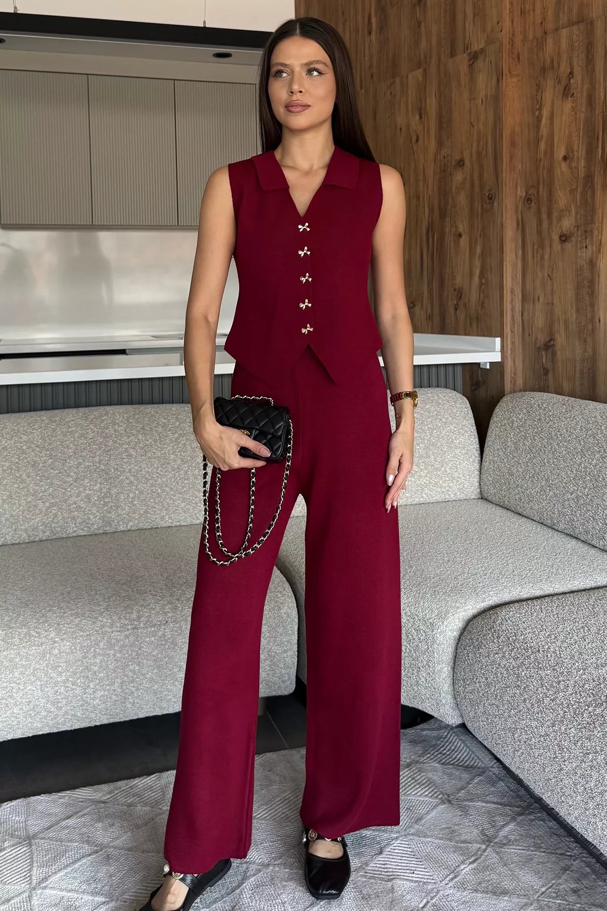 Modern tasarımıyla dikkat çeken gömlek yaka yelek pantolon triko ikili takım, şıklığı ve rahatlığı bir arada sunuyor. Yelek formundaki üst parça, zarif gömlek yaka detayı ve düğmeli tasarımıyla klasik bir görünüm kazandırırken, bel kısmındaki kesim sayesinde vücuda uyum sağlayarak zarif bir siluet oluşturuyor. Kolsuz yapısı, modern ve özgür bir tarz isteyenler için ideal bir seçenek sunuyor.