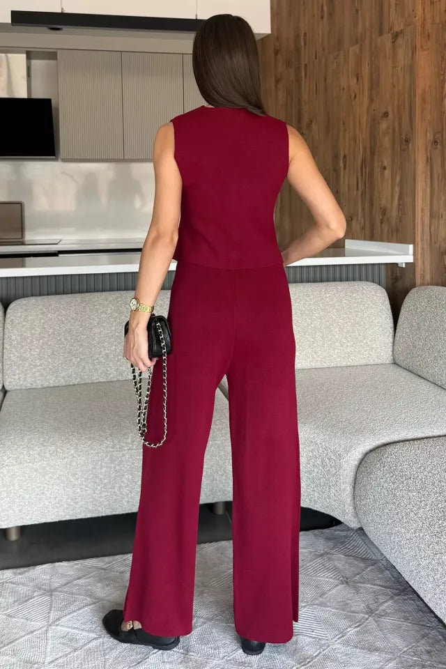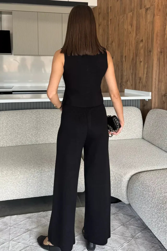 Takımın geniş paçalı pantolonu ise dökümlü formuyla gün boyu konfor sağlarken, elegan bir şıklık katıyor. Triko dokusu sayesinde hem yumuşak hem de dayanıklı bir yapı sunan takım, mevsim geçişlerinde olduğu kadar özel günlerde de tercih edilebilir. Şıklık arayan kadınların gardırobunda zamansız bir parça olarak yerini alır.