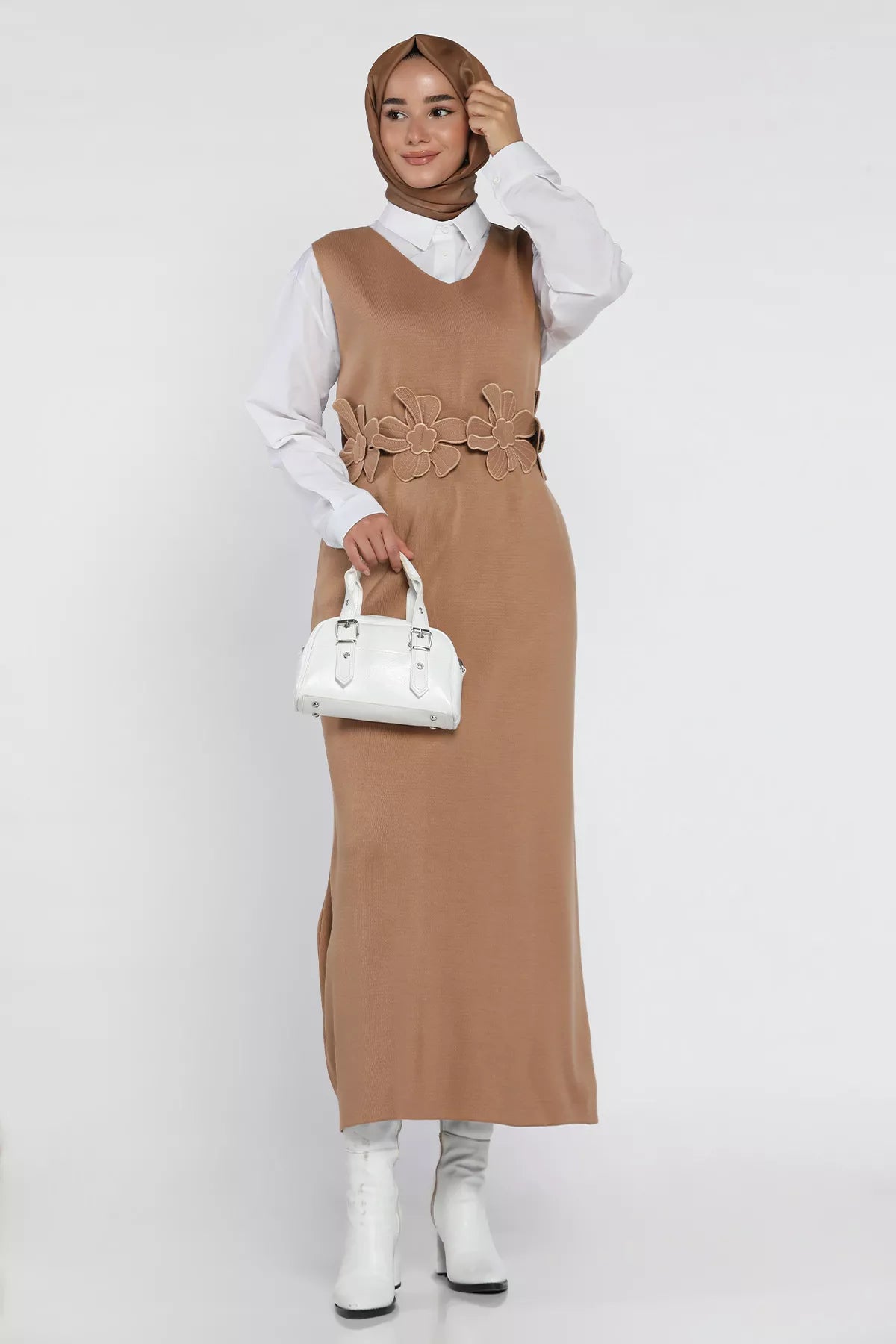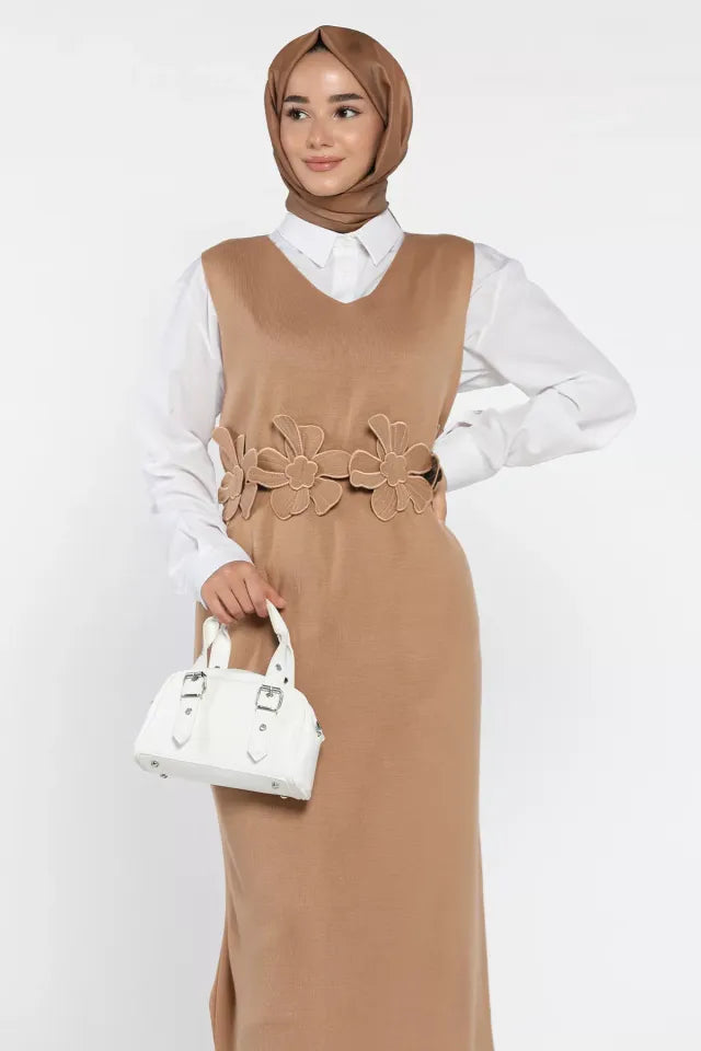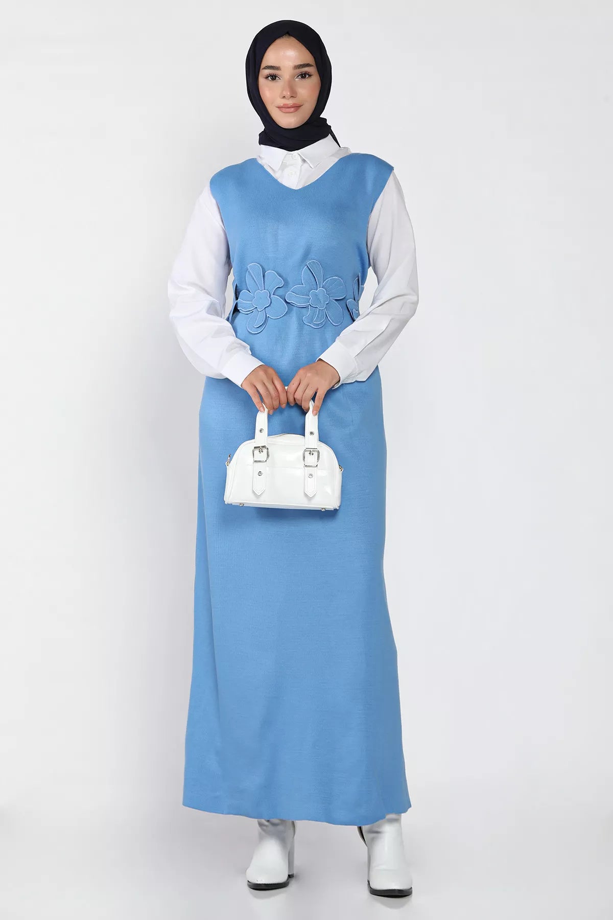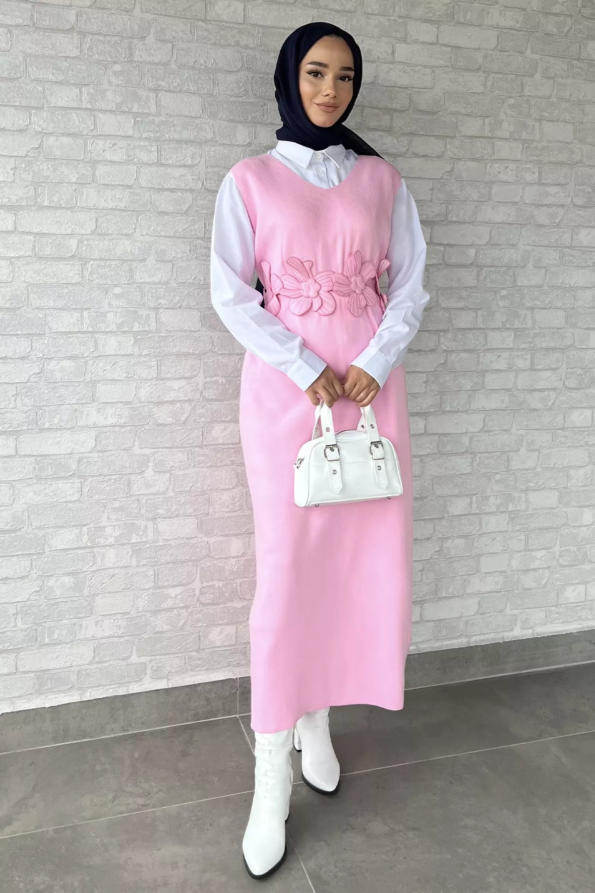 Gül Figürlü Triko Elbise Gömlek Tesettür İkili Takım