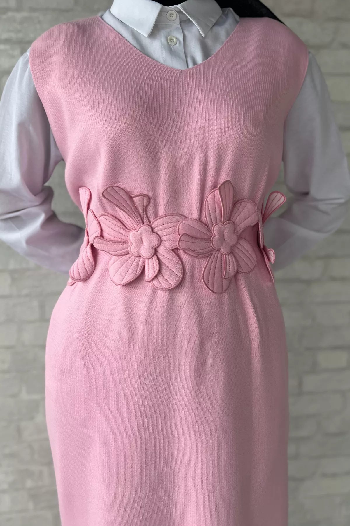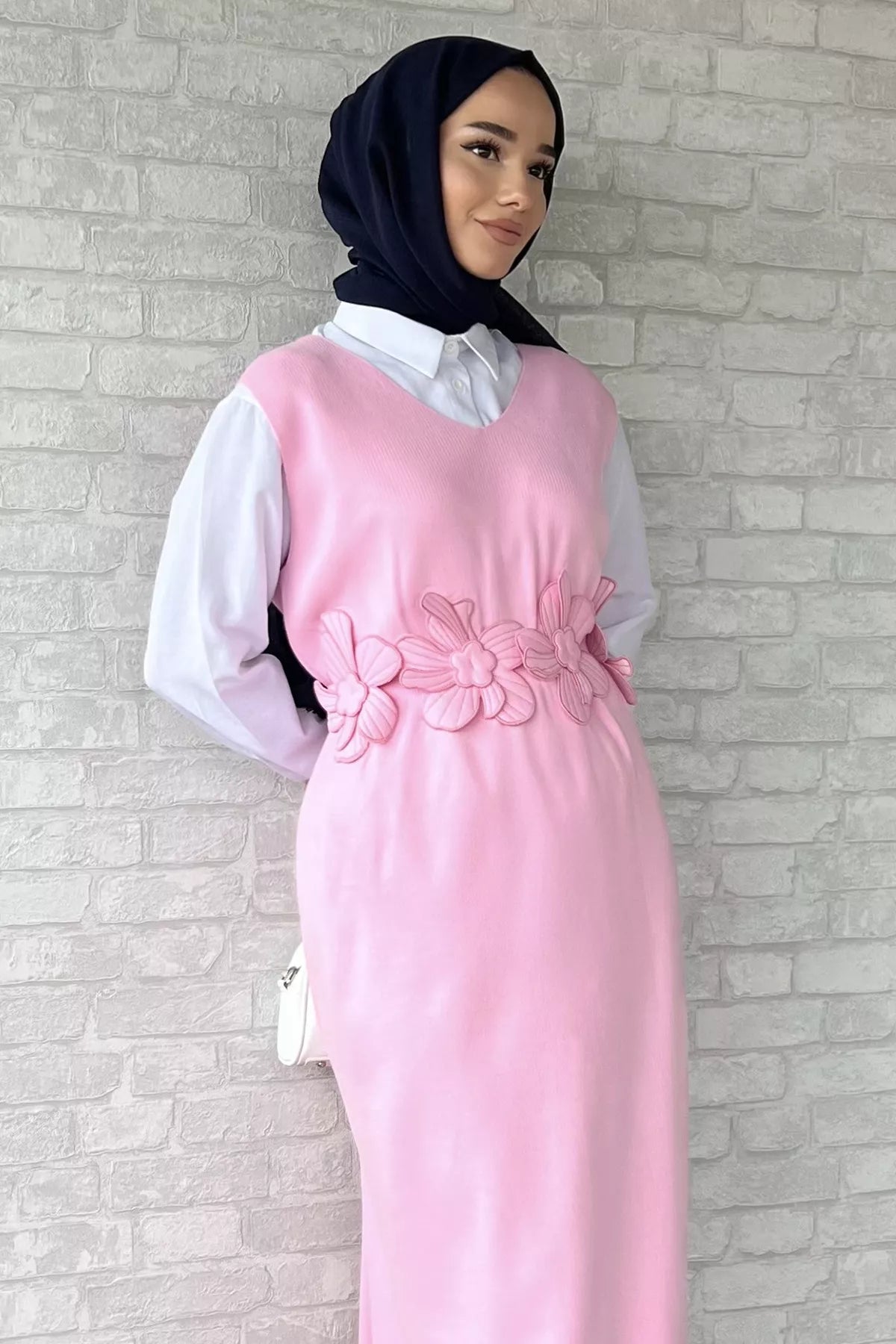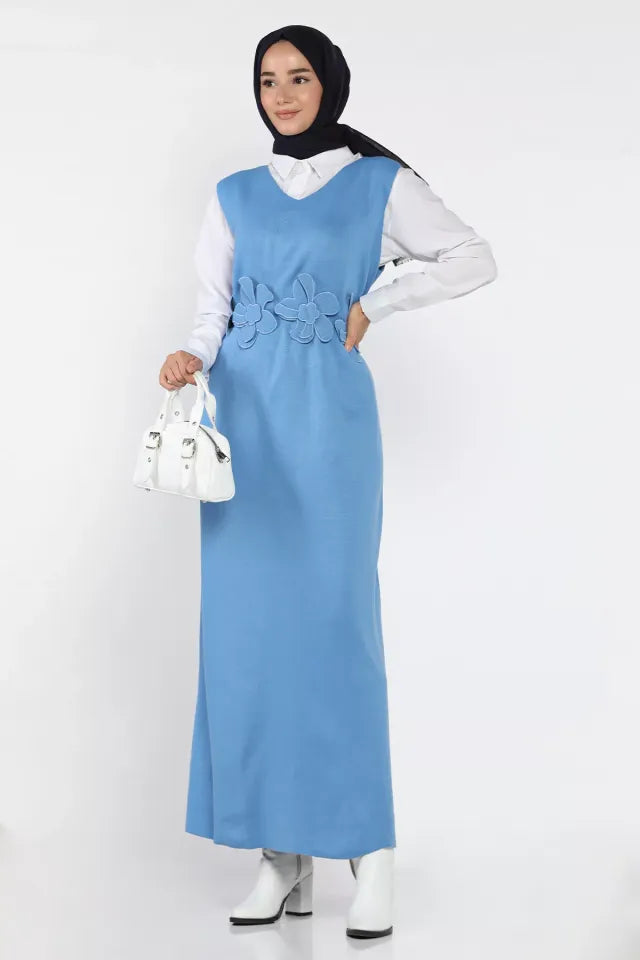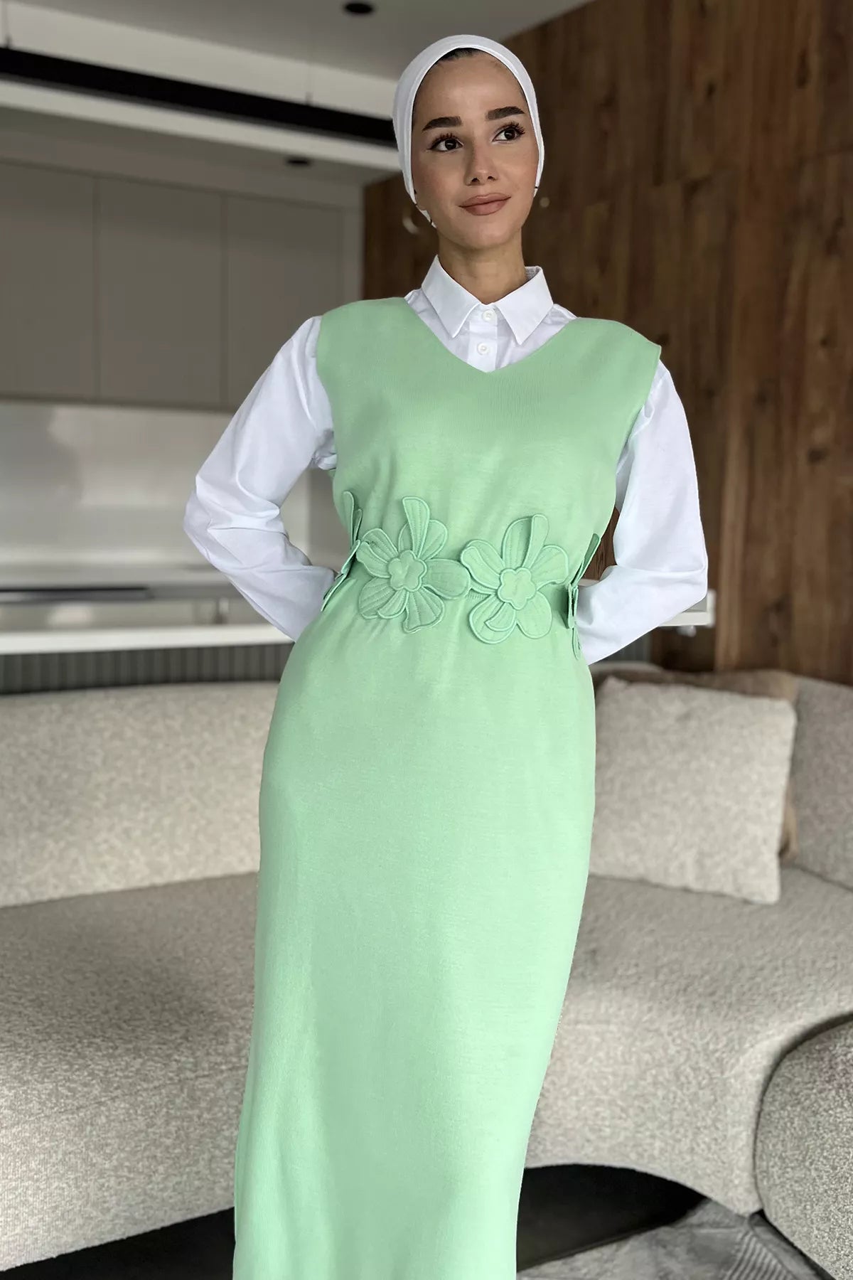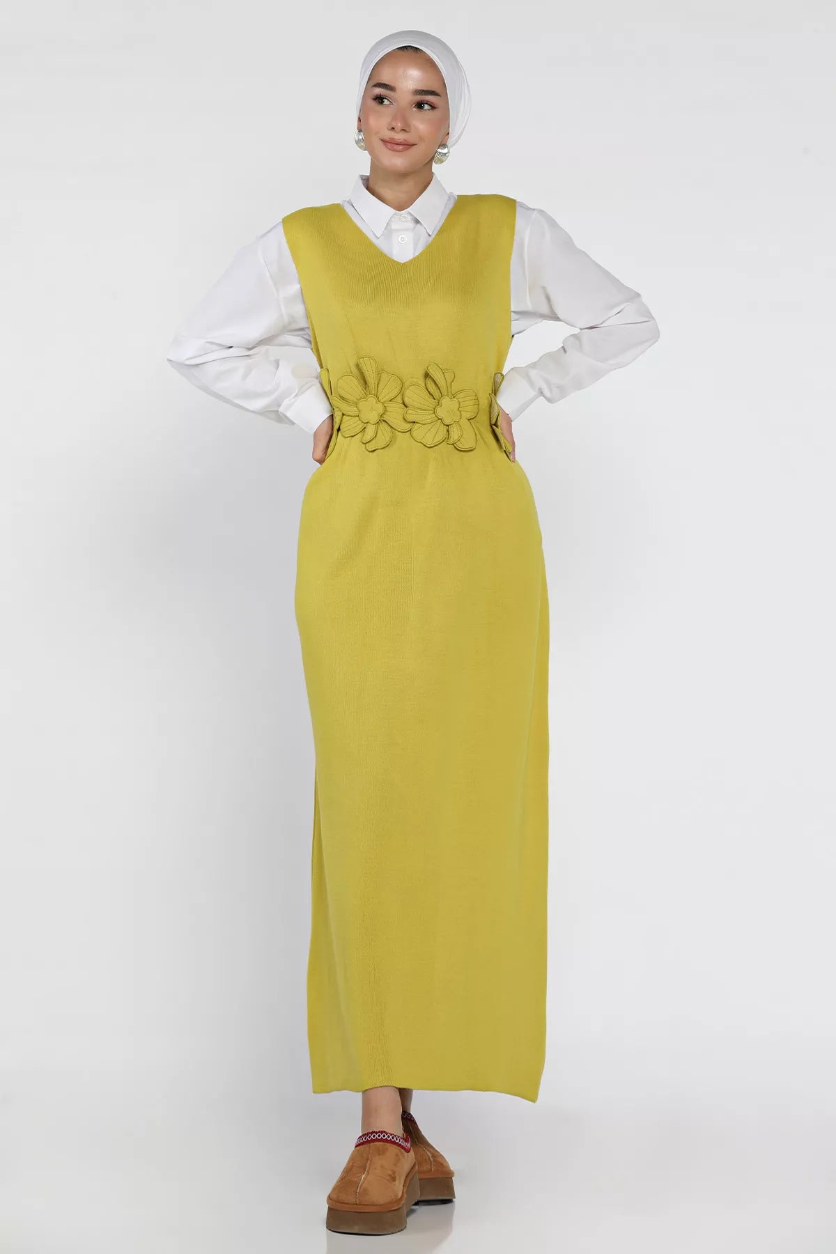Gül Figürlü Triko Elbise Gömlek Tesettür İkili Takım