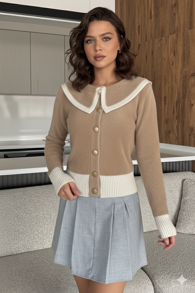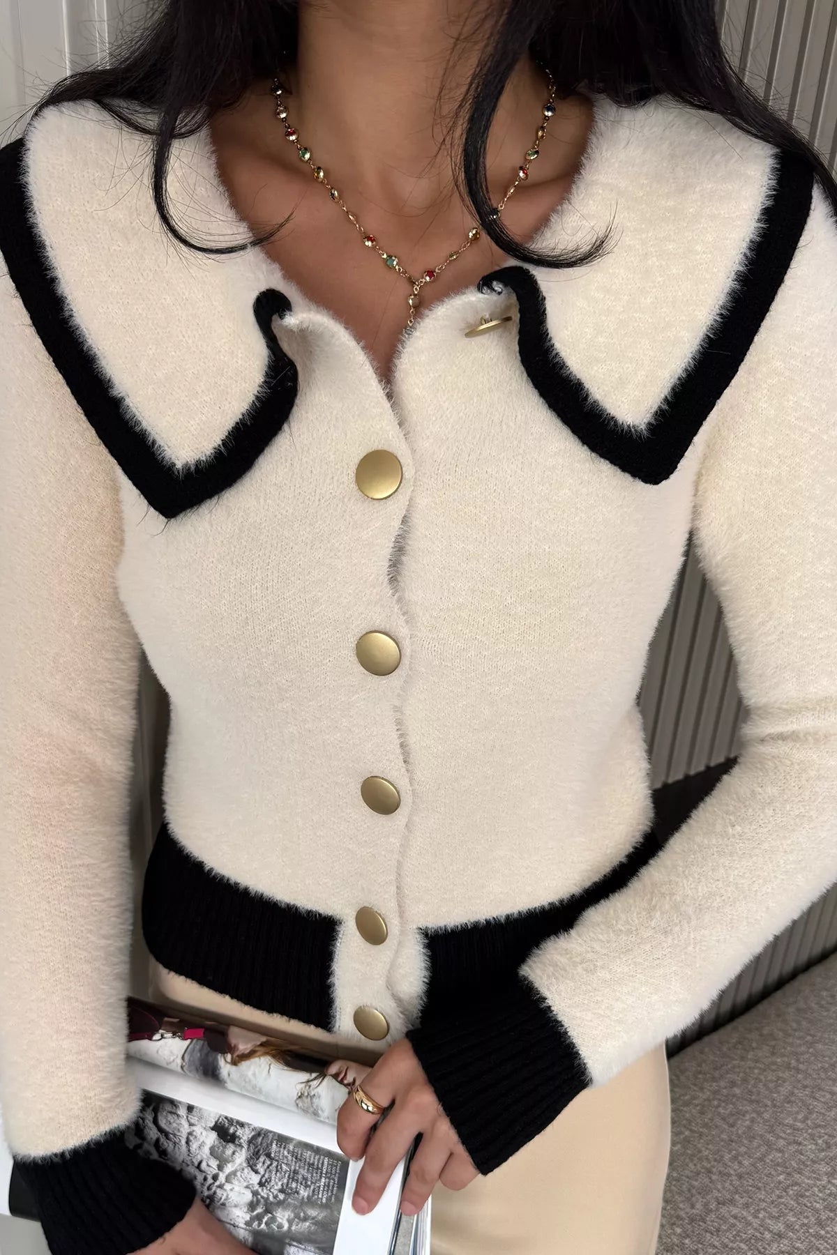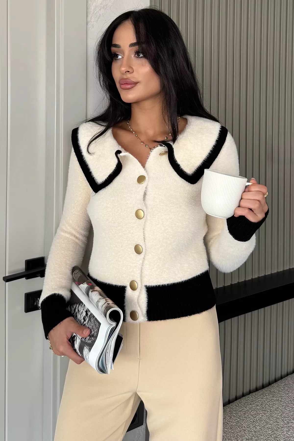 Modern ve feminen bir çizgiye sahip bu kadın triko ceket, dikkat çekici bebe yaka detayıyla farklı bir şıklık sunuyor. Büyük düğmeleri ve kontrast renkli yaka, kol ve etek ucu detayları, tasarıma hem retro hem de zarif bir hava katıyor. Yumuşacık dokusu sayesinde teninizi rahatsız etmeden gün boyu konfor sağlar.