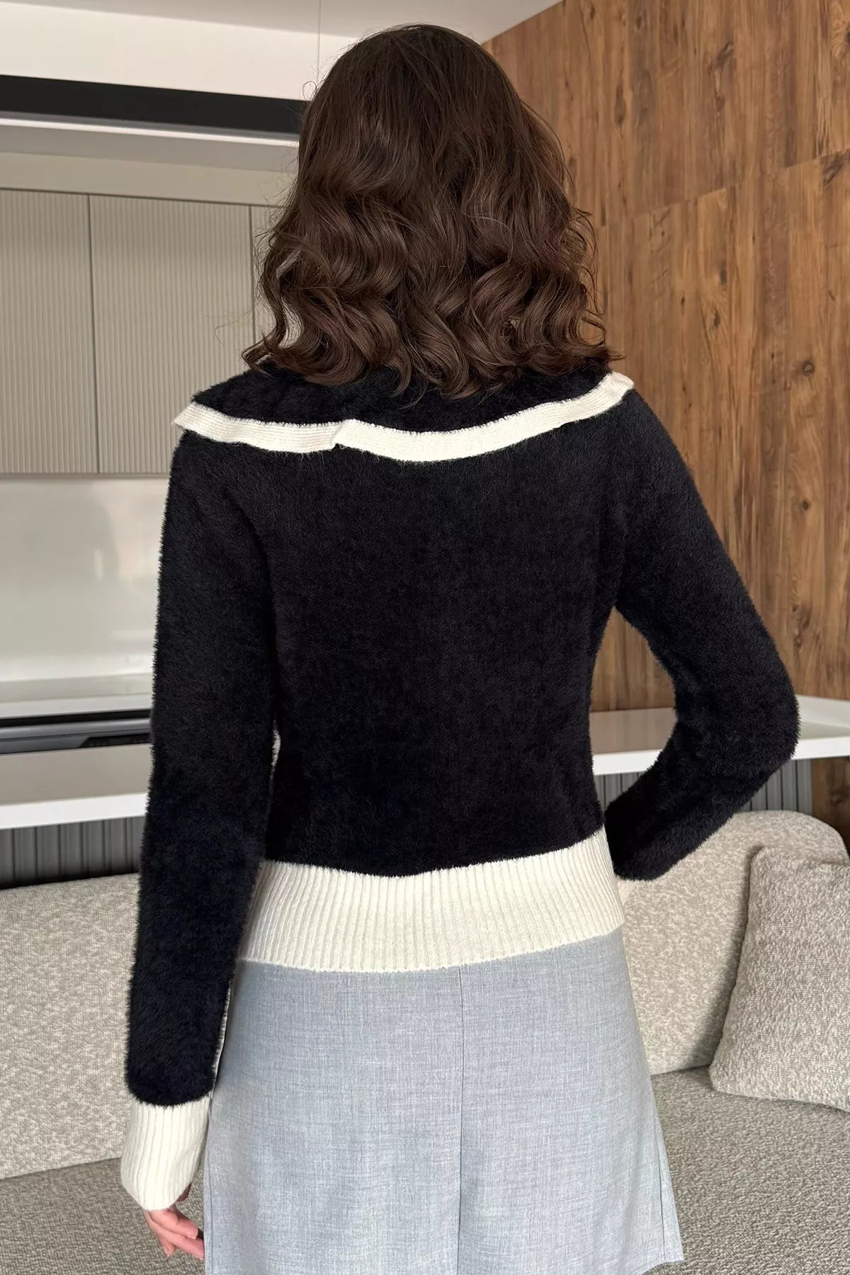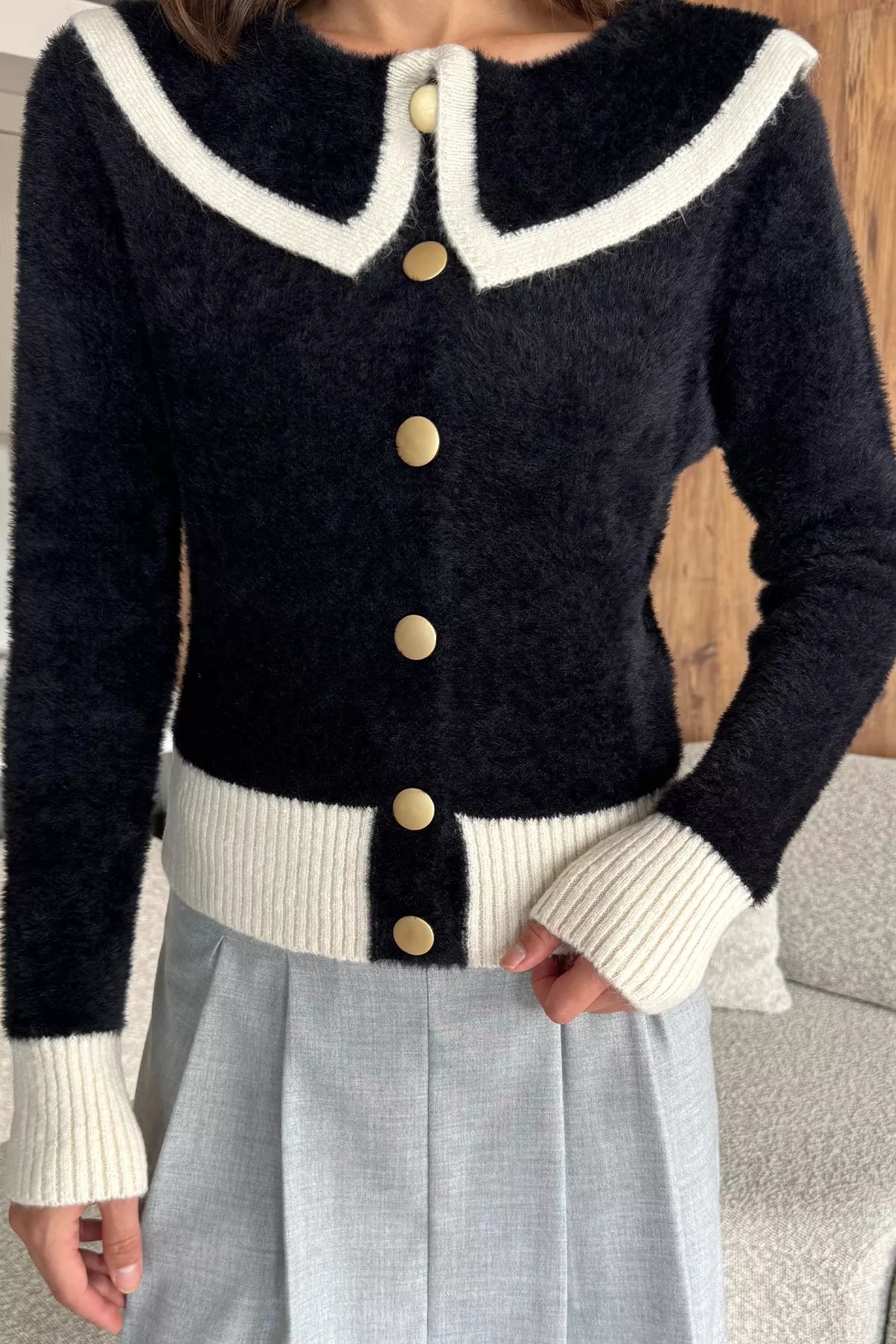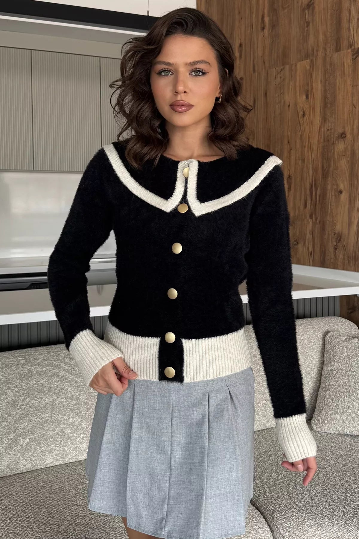 Modern ve feminen bir çizgiye sahip bu kadın triko ceket, dikkat çekici bebe yaka detayıyla farklı bir şıklık sunuyor. Büyük düğmeleri ve kontrast renkli yaka, kol ve etek ucu detayları, tasarıma hem retro hem de zarif bir hava katıyor. Yumuşacık dokusu sayesinde teninizi rahatsız etmeden gün boyu konfor sağlar.
