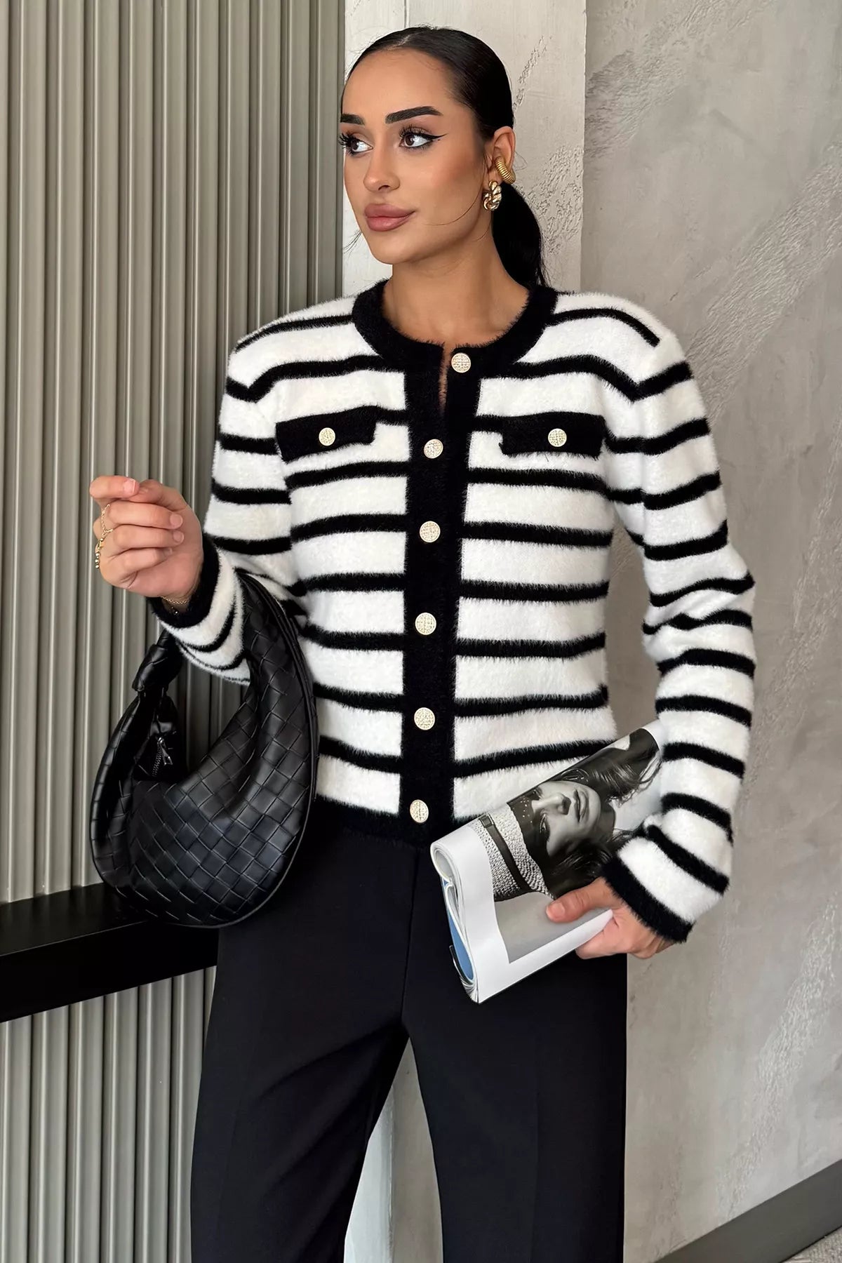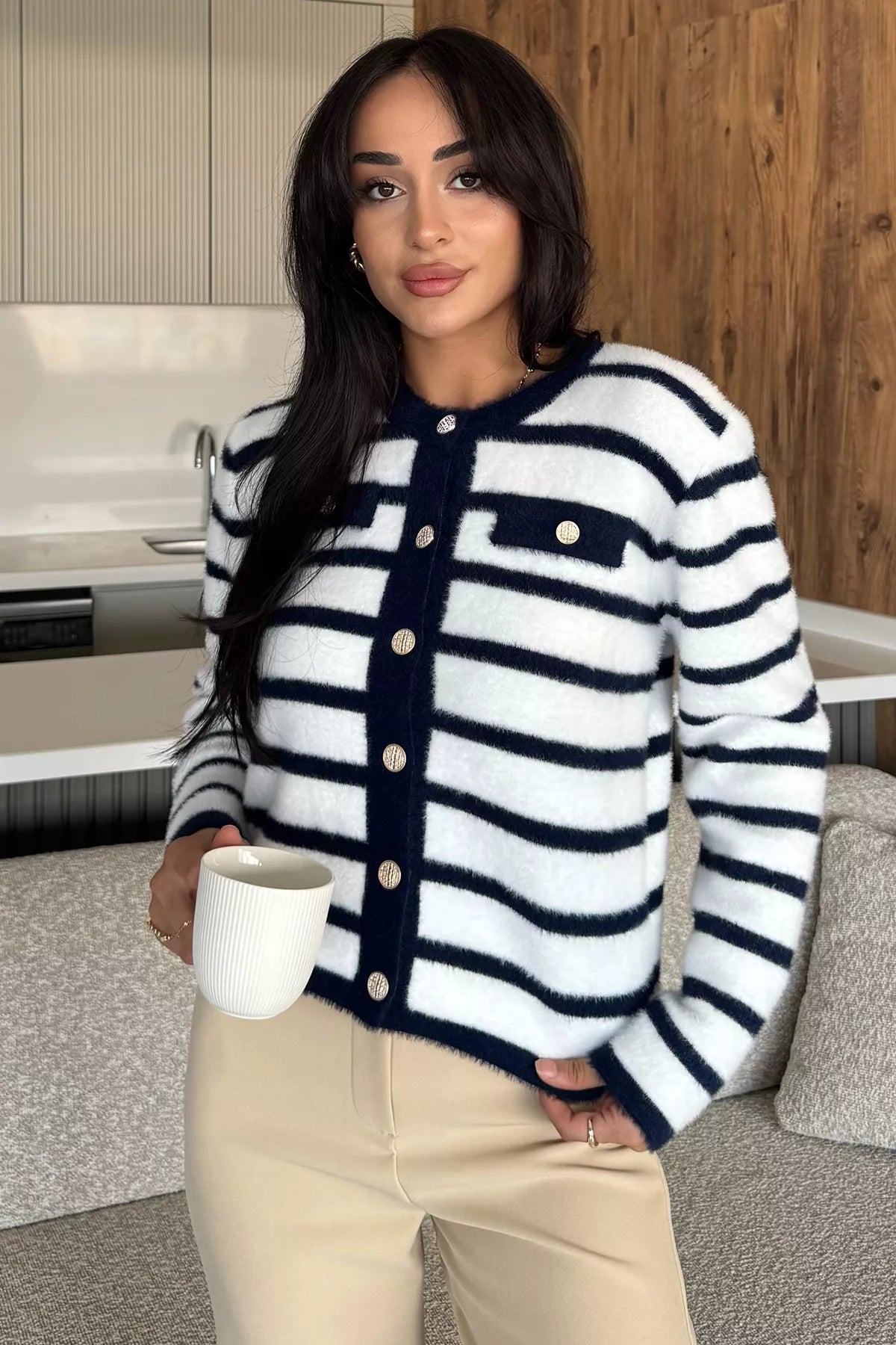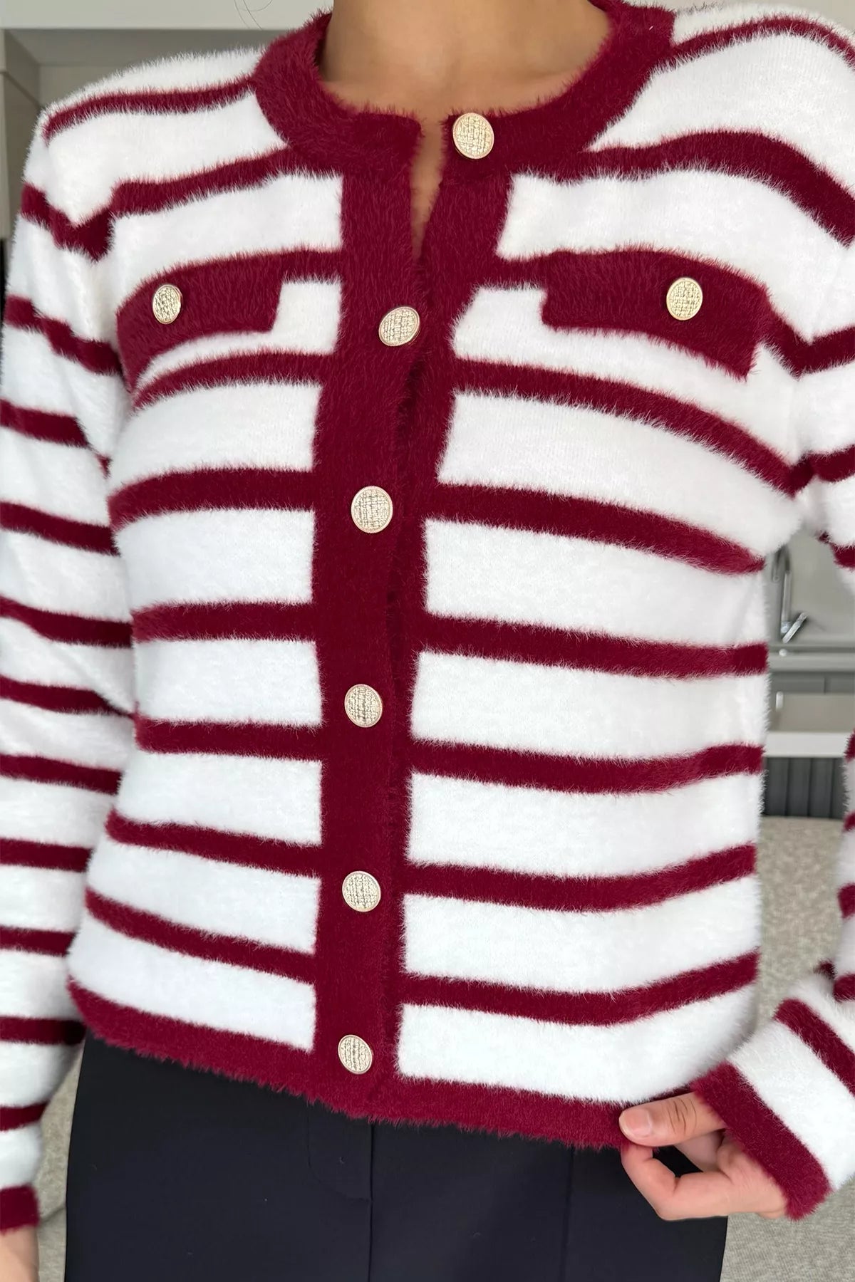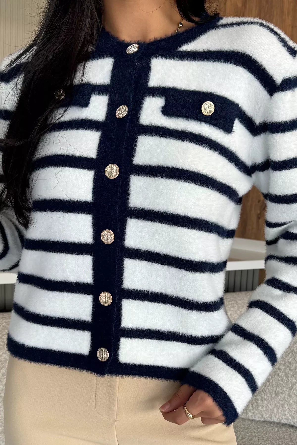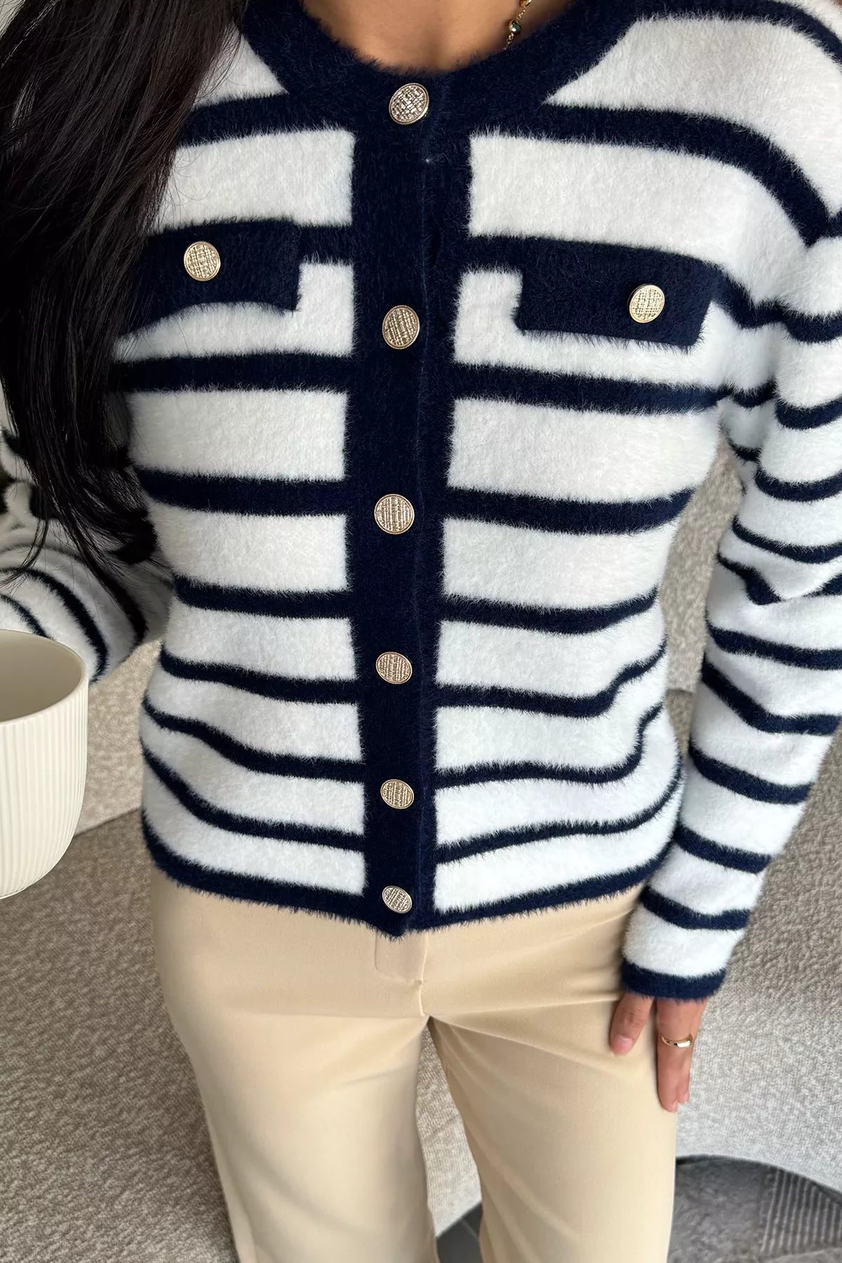 Kadın Çizgi Desenli Gold Düğmeli Yumoş Triko Ceket