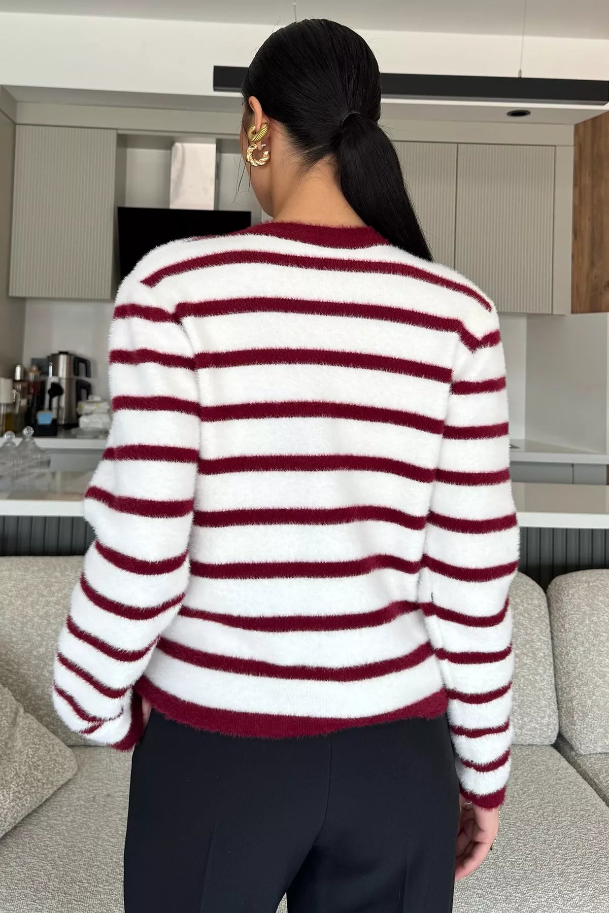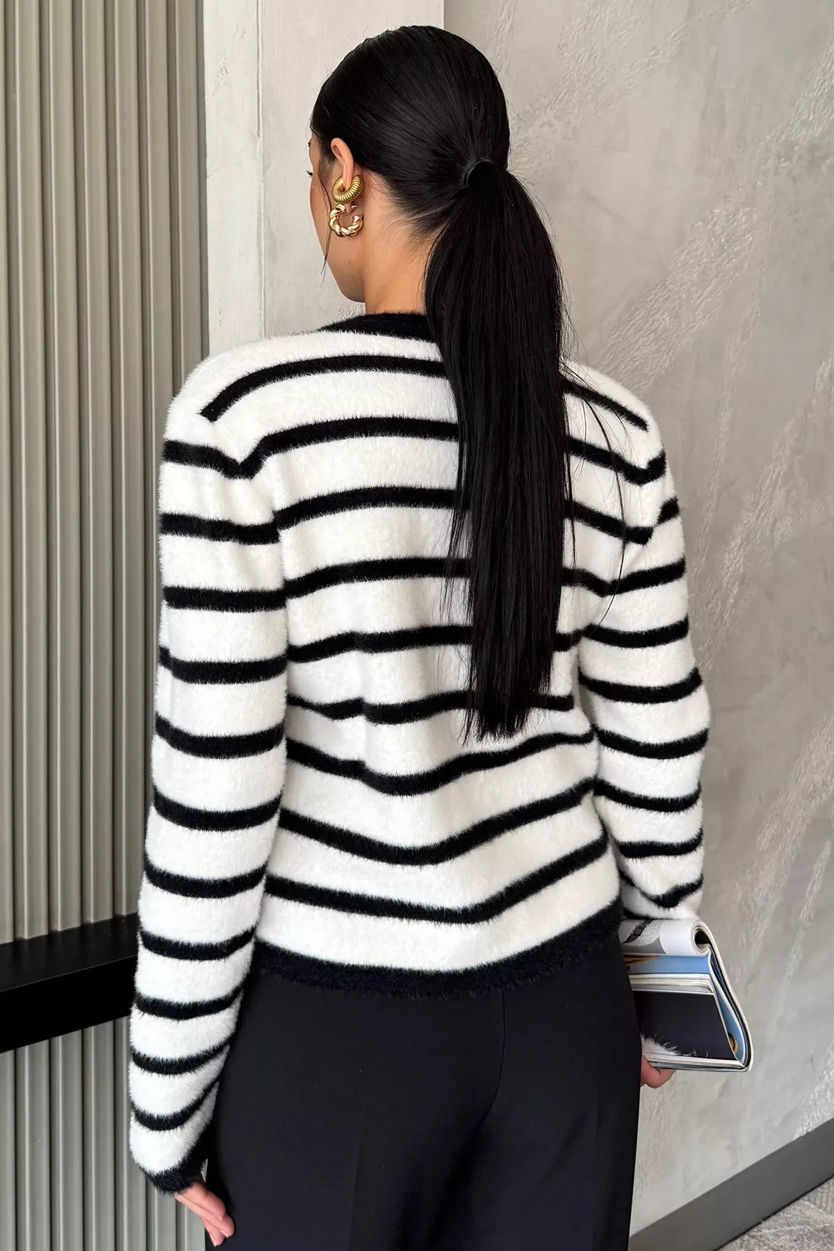 Kadın Çizgi Desenli Yumoş Triko Ceket