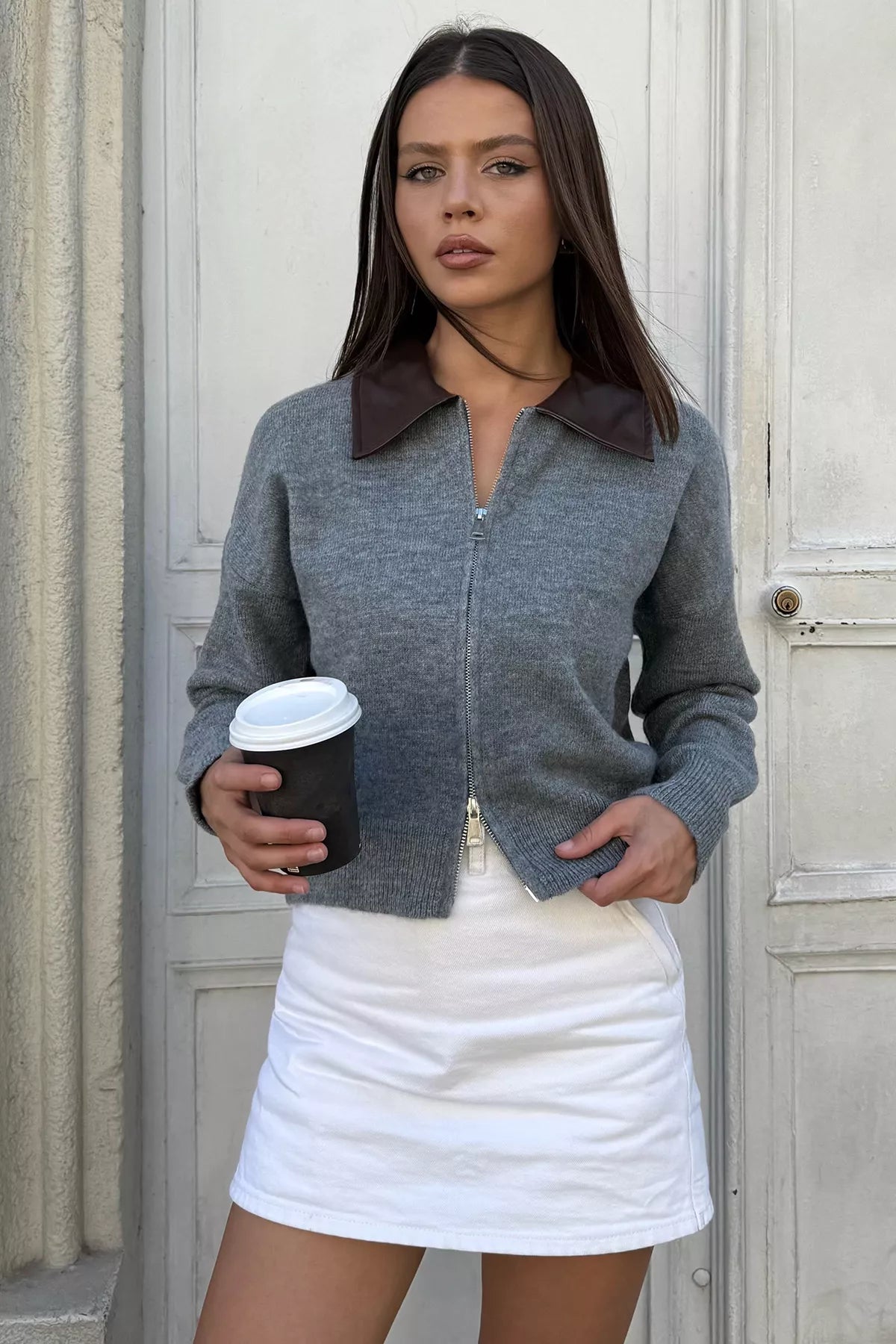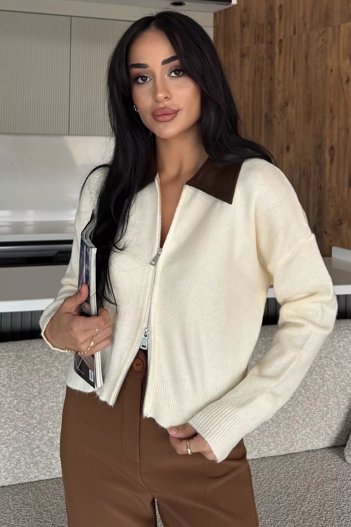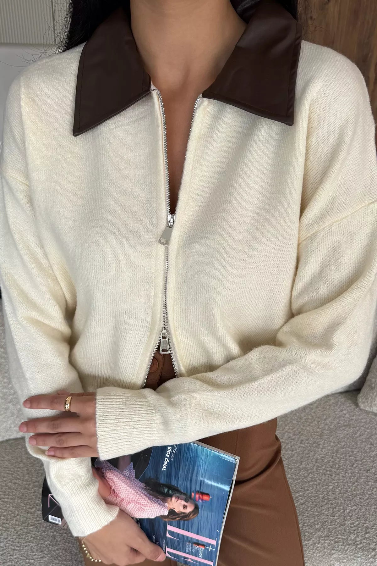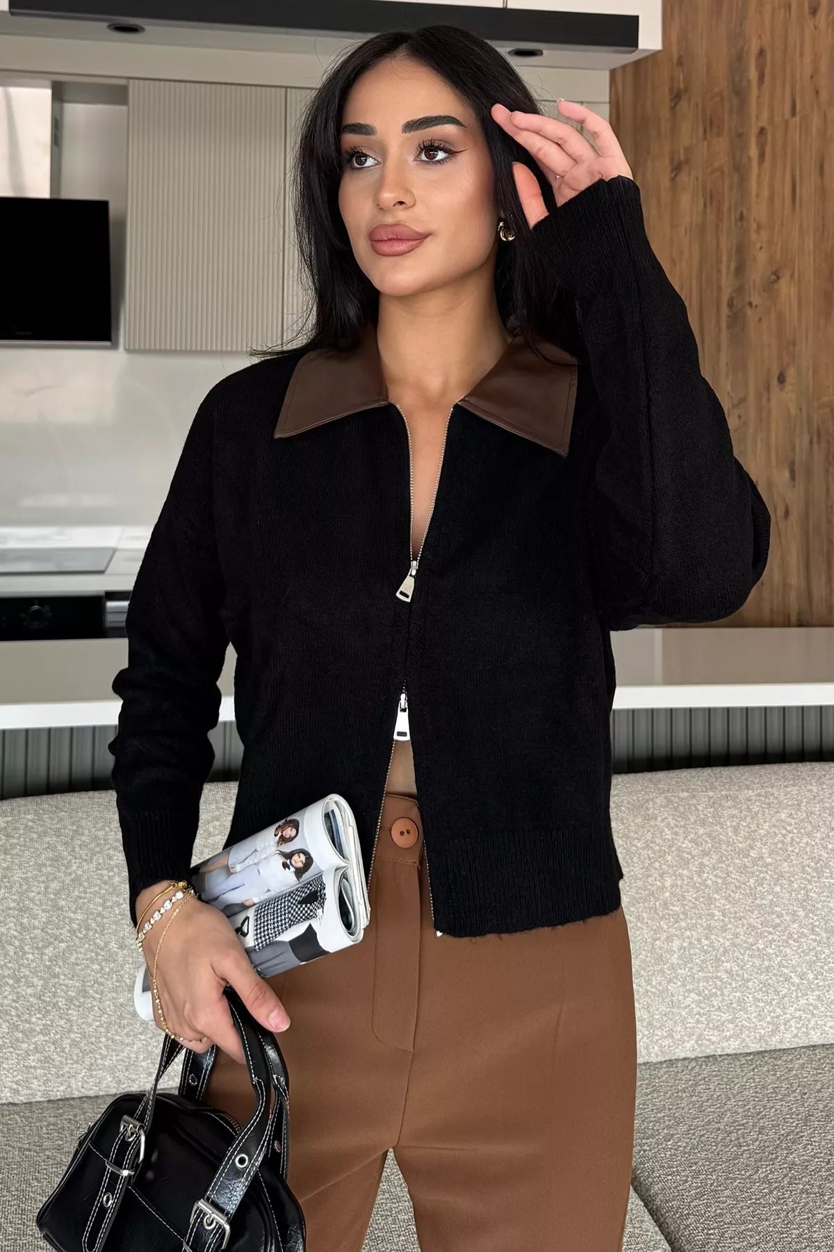 Kadın Polo Yaka Deri Garnili Fermuarlı Triko Hırka