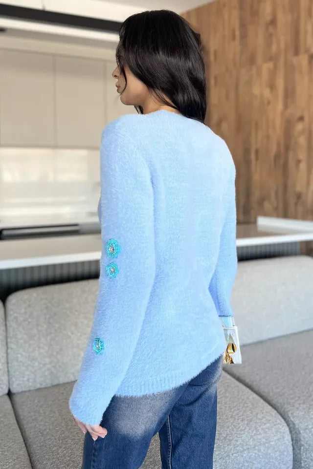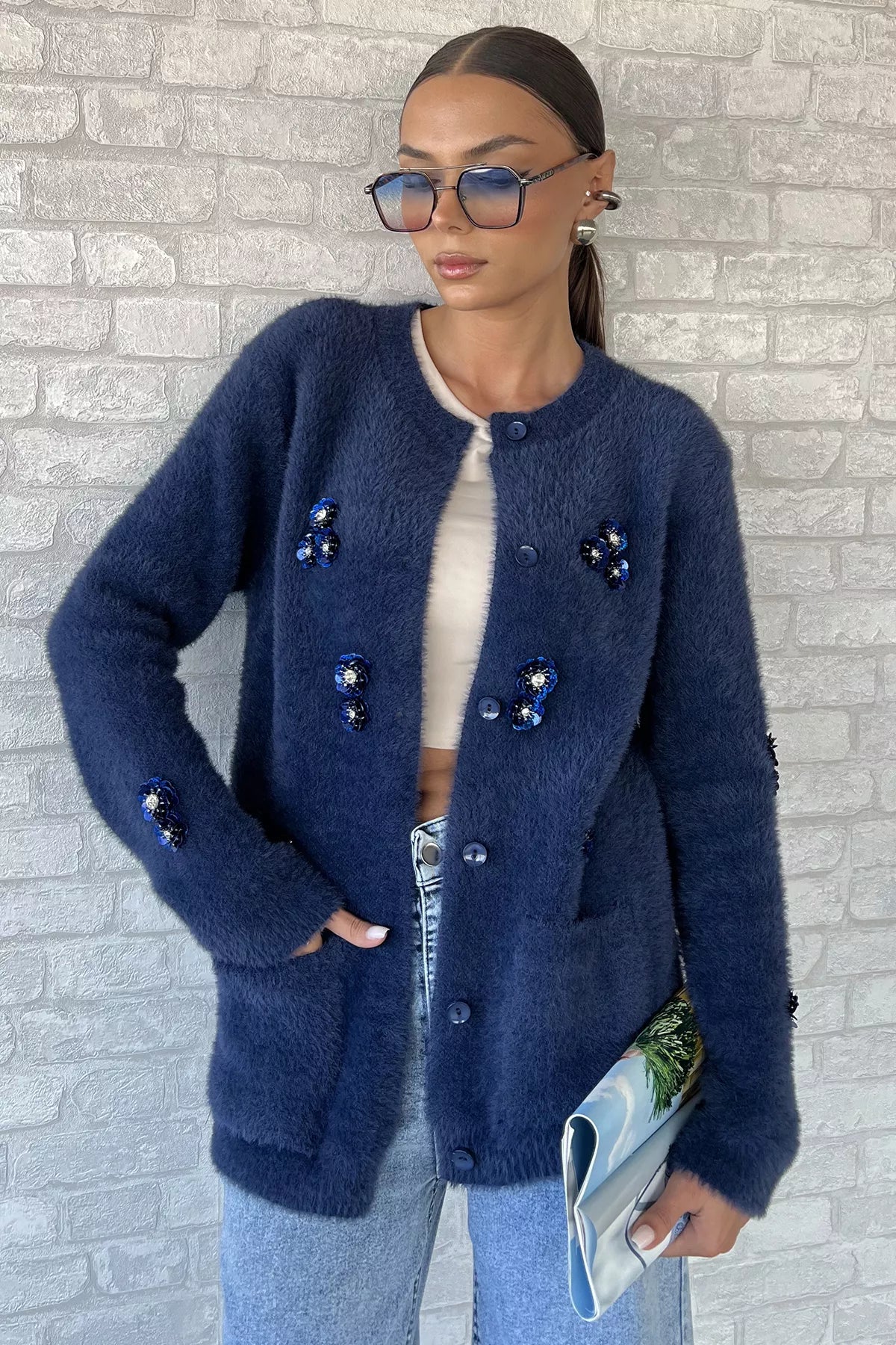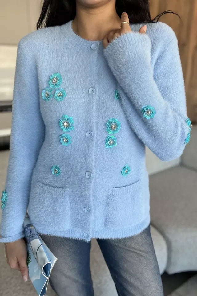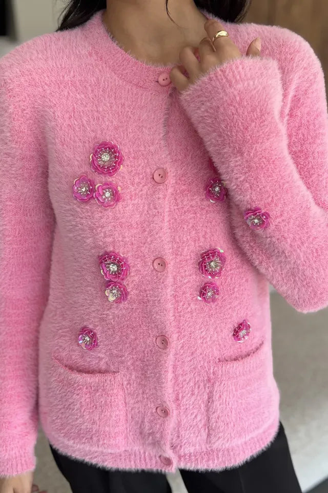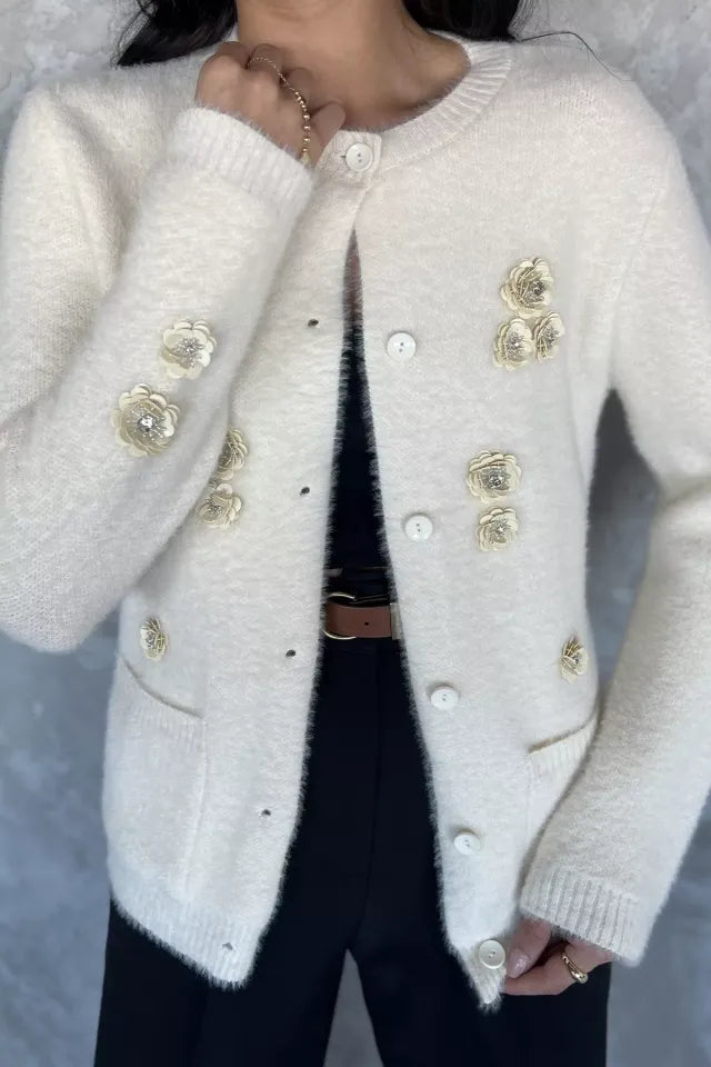 Zarif detaylarıyla öne çıkan triko ceket, yumuşak dokulu ipliği ve el işçiliğini andıran pul işlemeleriyle dikkat çeker. Ön kısmındaki düğme detayı sayesinde pratik bir kullanım sunarken, ceplerle tamamlanan tasarım hem işlevsel hem de şık bir görünüm kazandırır. Parlak pul işlemeleri ürüne modern ve feminen bir hava katar.