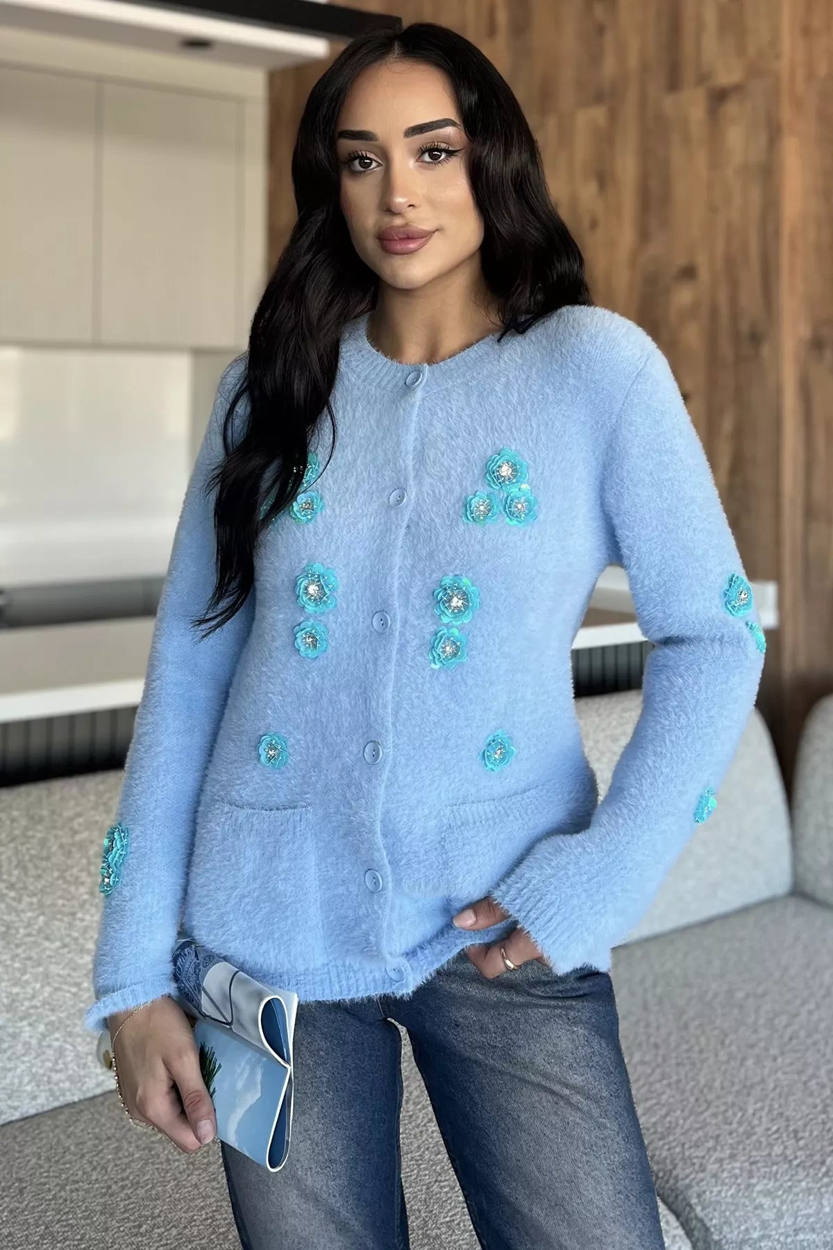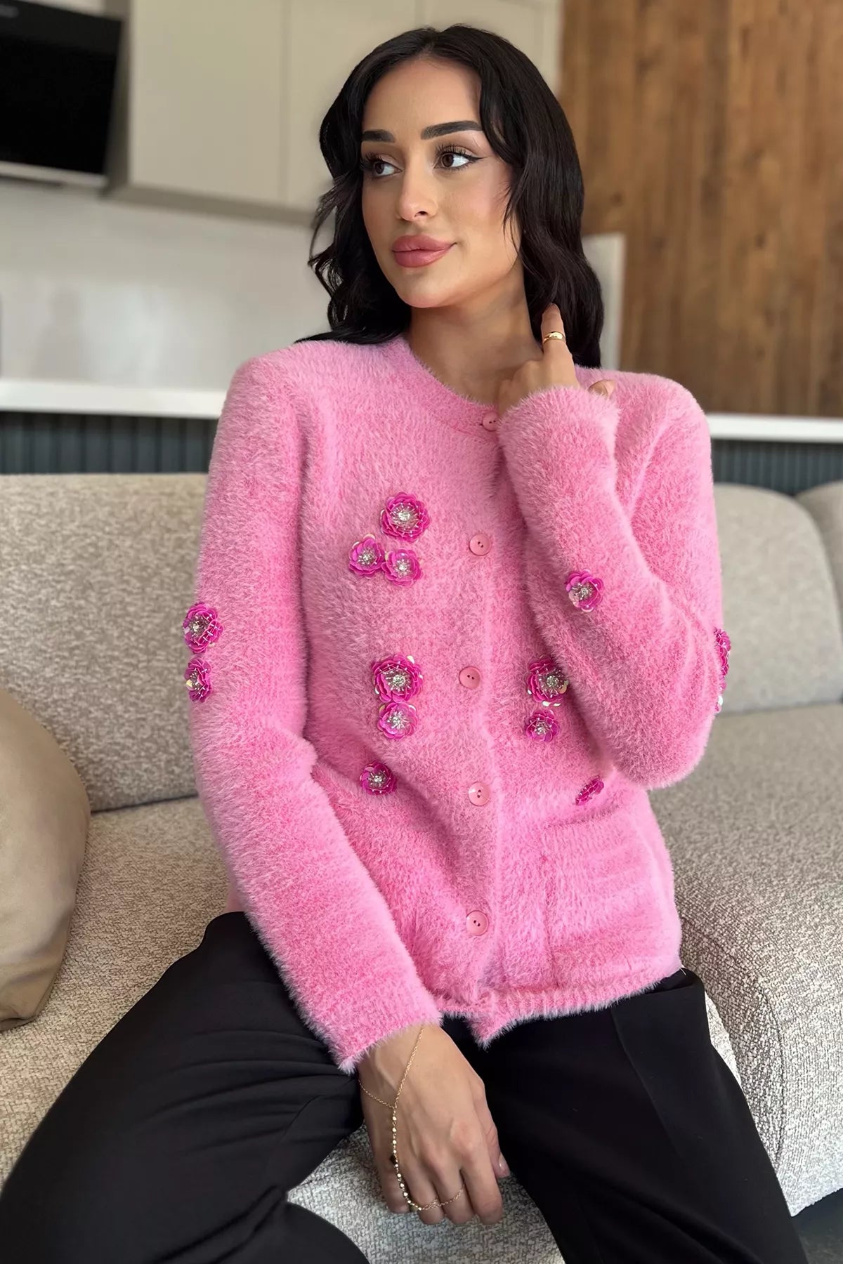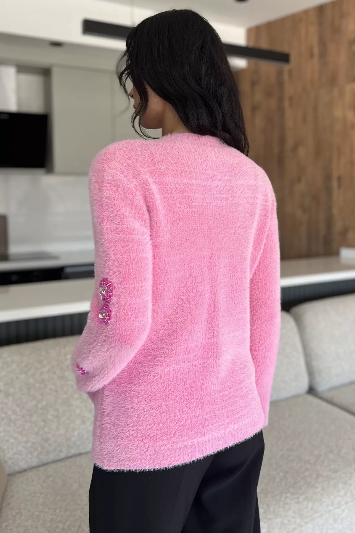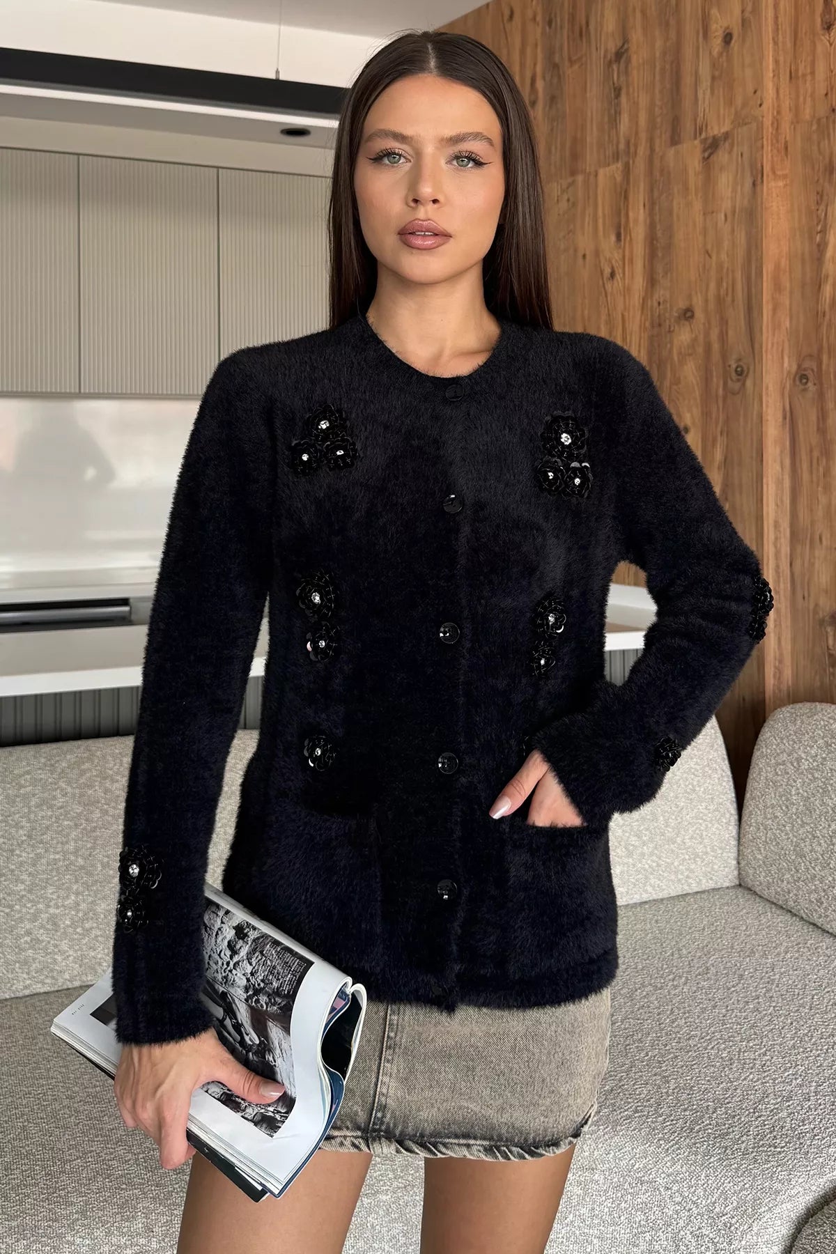Zarif detaylarıyla öne çıkan triko ceket, yumuşak dokulu ipliği ve el işçiliğini andıran pul işlemeleriyle dikkat çeker. Ön kısmındaki düğme detayı sayesinde pratik bir kullanım sunarken, ceplerle tamamlanan tasarım hem işlevsel hem de şık bir görünüm kazandırır. Parlak pul işlemeleri ürüne modern ve feminen bir hava katar.