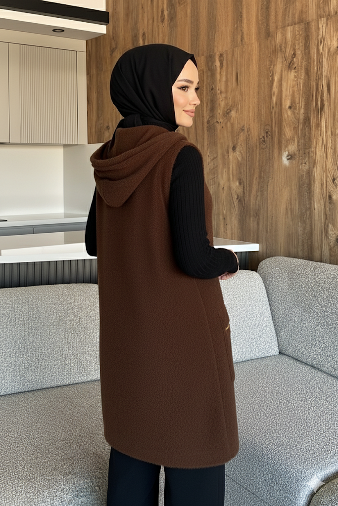 Modern ve kullanışlı tasarımıyla öne çıkan tesettür triko yelek, kolsuz formu sayesinde katmanlı kombinler için ideal bir parçadır. Ön kısmında yer alan fermuar detayı pratik kullanım sağlarken, ceplerdeki gold fermuar detayları şıklığı artırır. Yumuşak dokusu ile rahatlık sunan bu yelek, günlük kombinlerde konforu ön plana çıkarır.