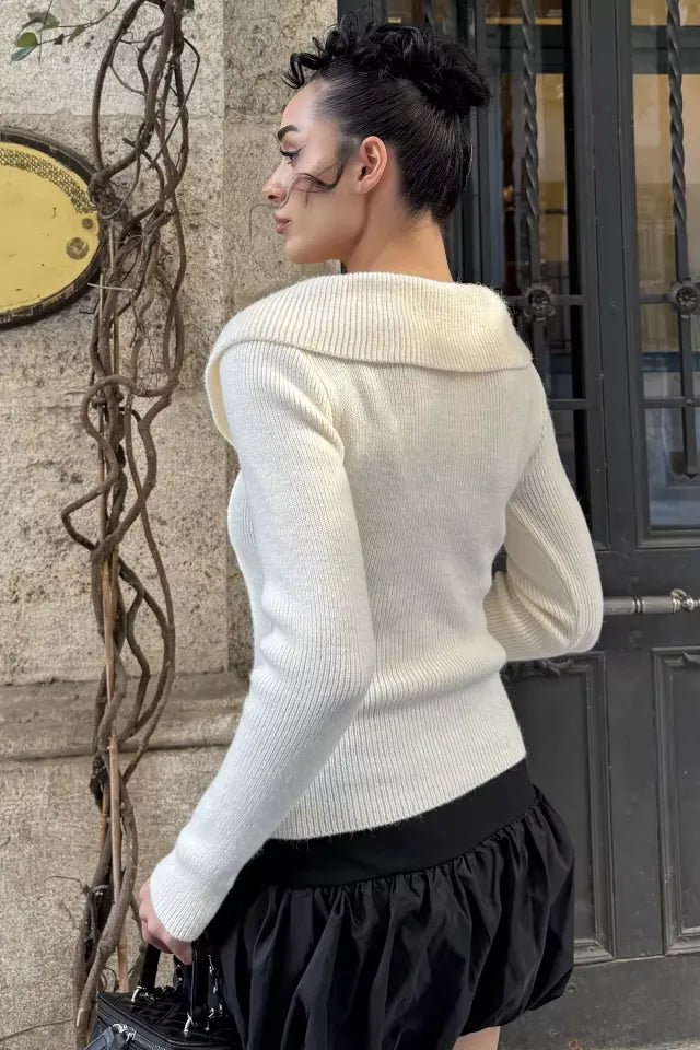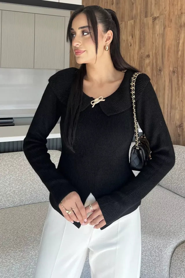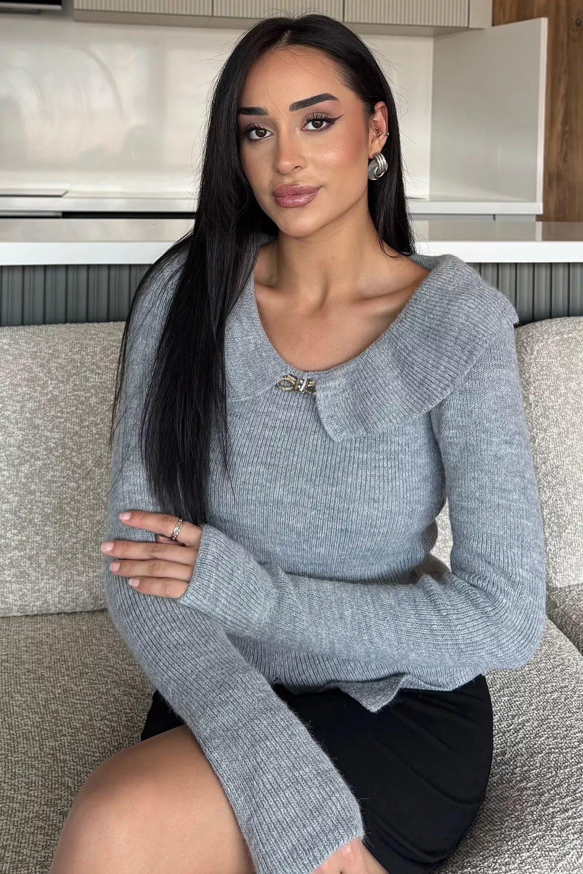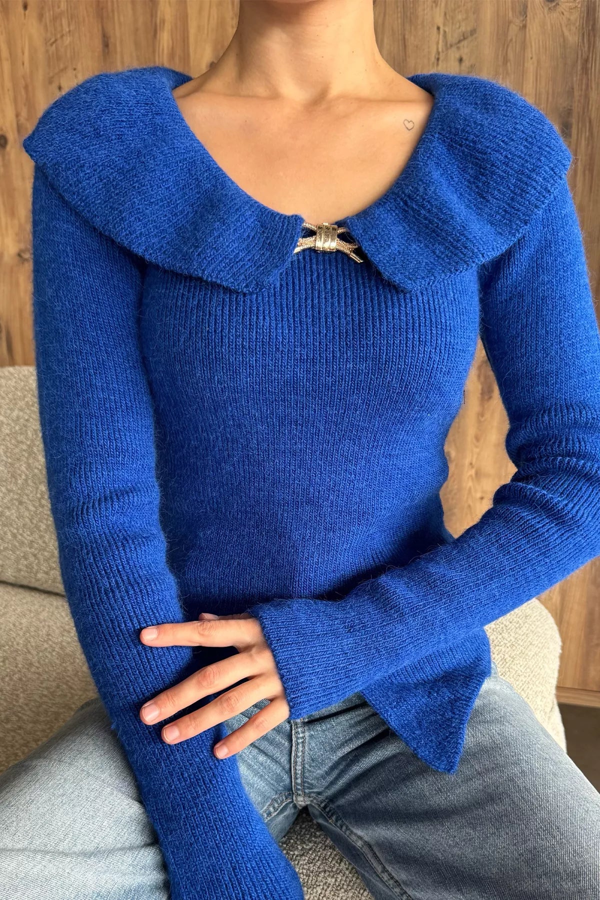 Zarif detaylarıyla öne çıkan triko bluz, geniş yakası ve ortasında yer alan dekoratif broşuyla feminen bir stil sunar. Bel kısmındaki yırtmaç detayı modern bir dokunuş kazandırırken, ince triko dokusu ürüne şık bir görünüm katmaktadır. Uzun kollu yapısı sayesinde hem günlük kombinlere hem de özel anlara uyum sağlar.