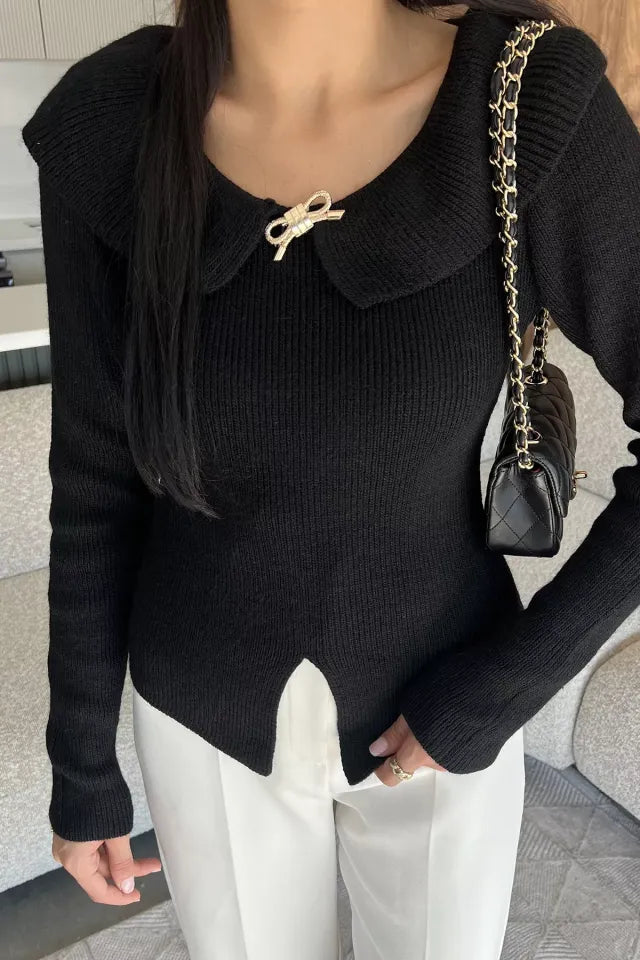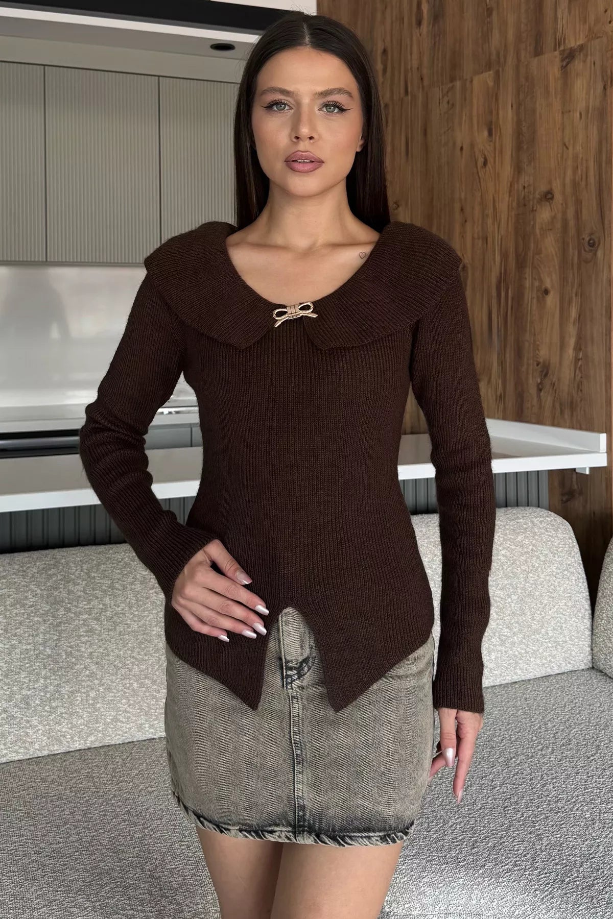 Ön Broşlu Bel Yırtmaçlı Triko Bluz