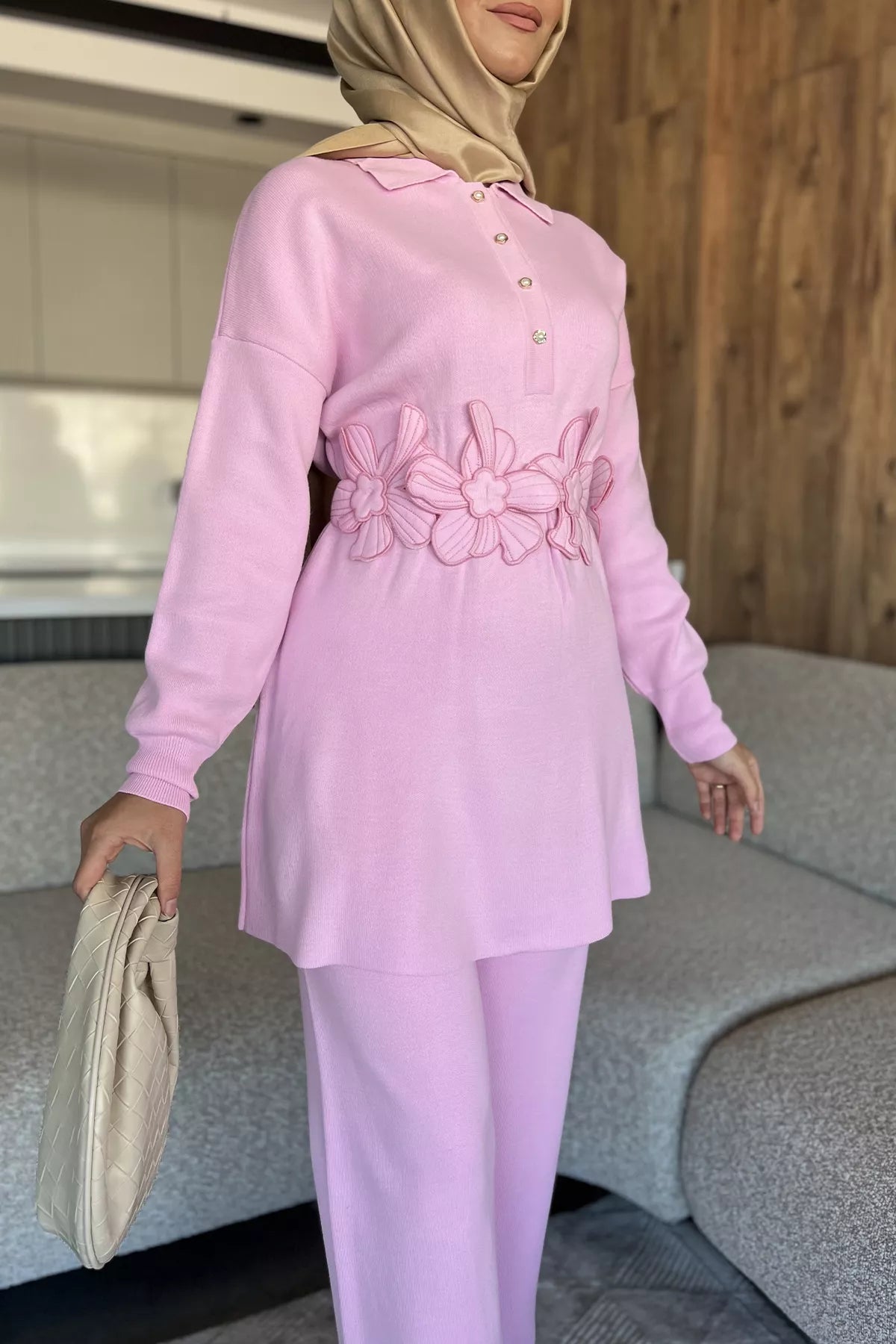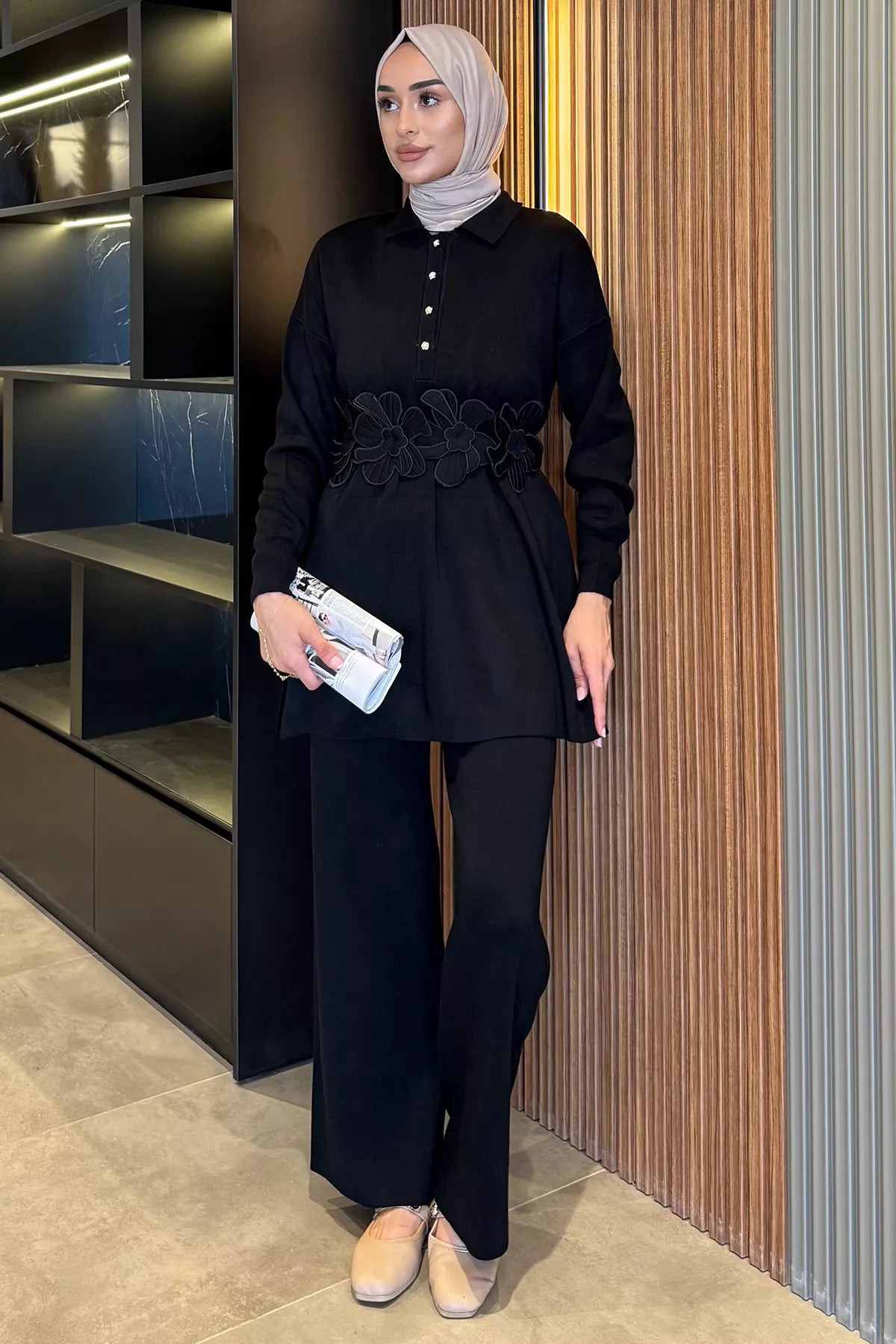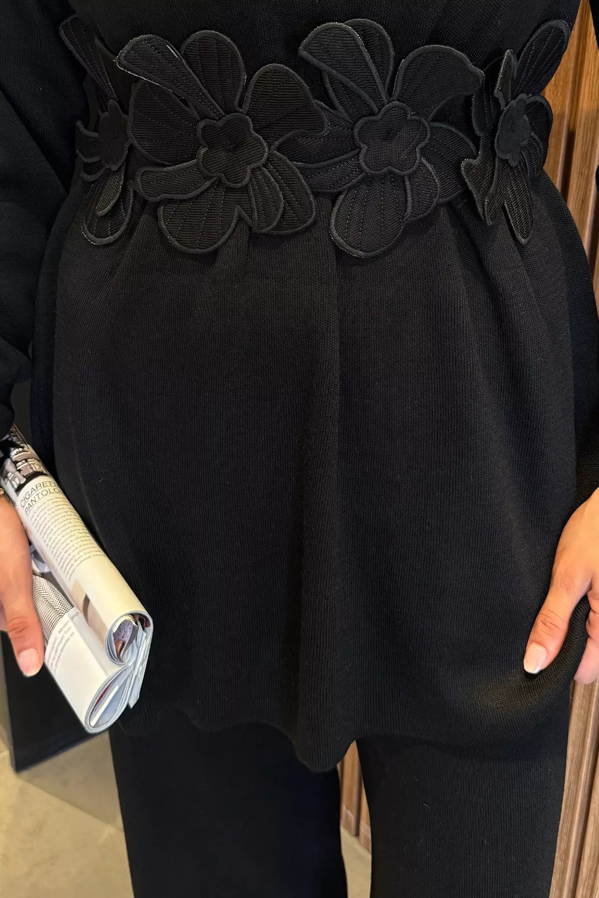 Papatya Aplikeli Tunik Pantolon Triko Tesettür İkili Takım