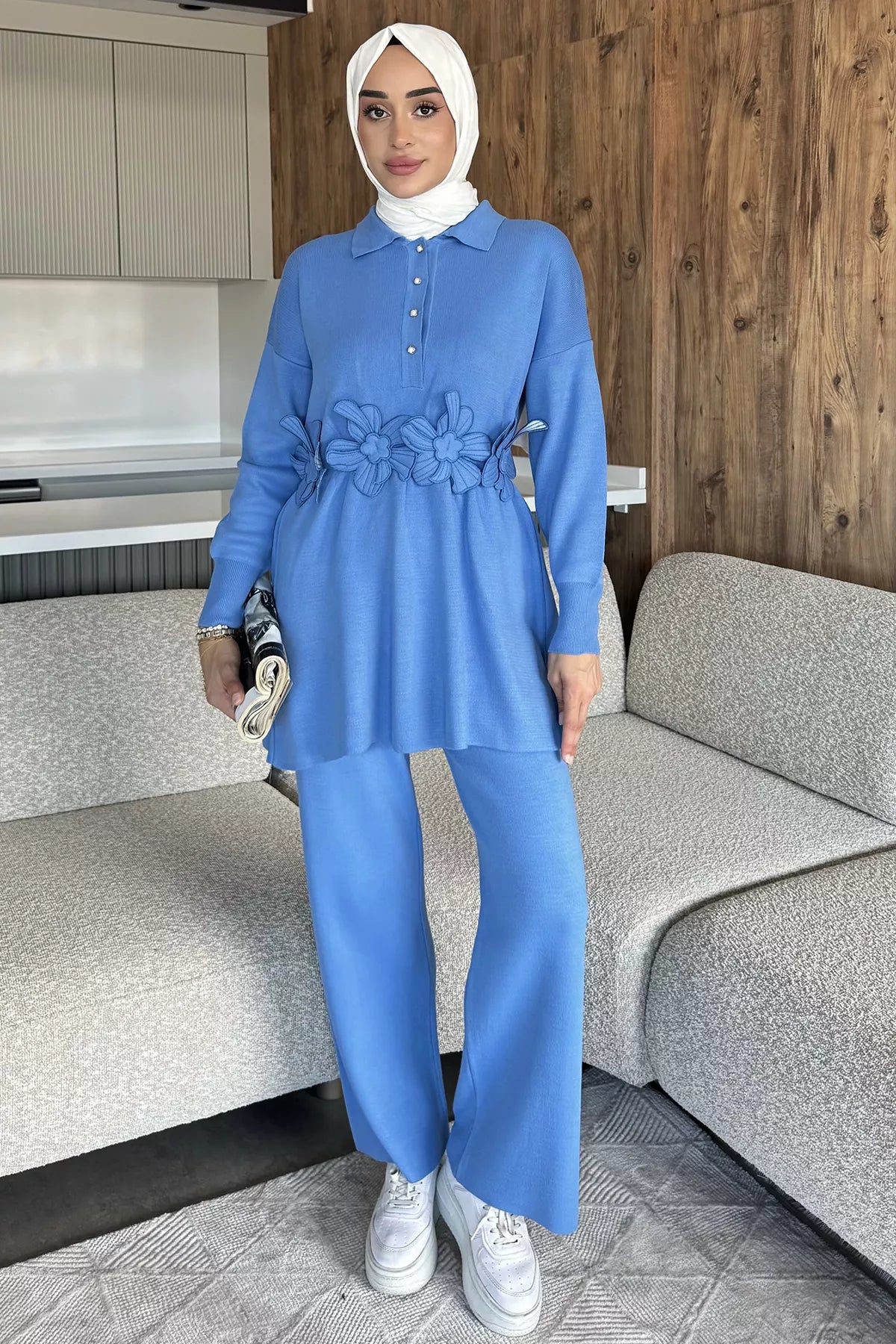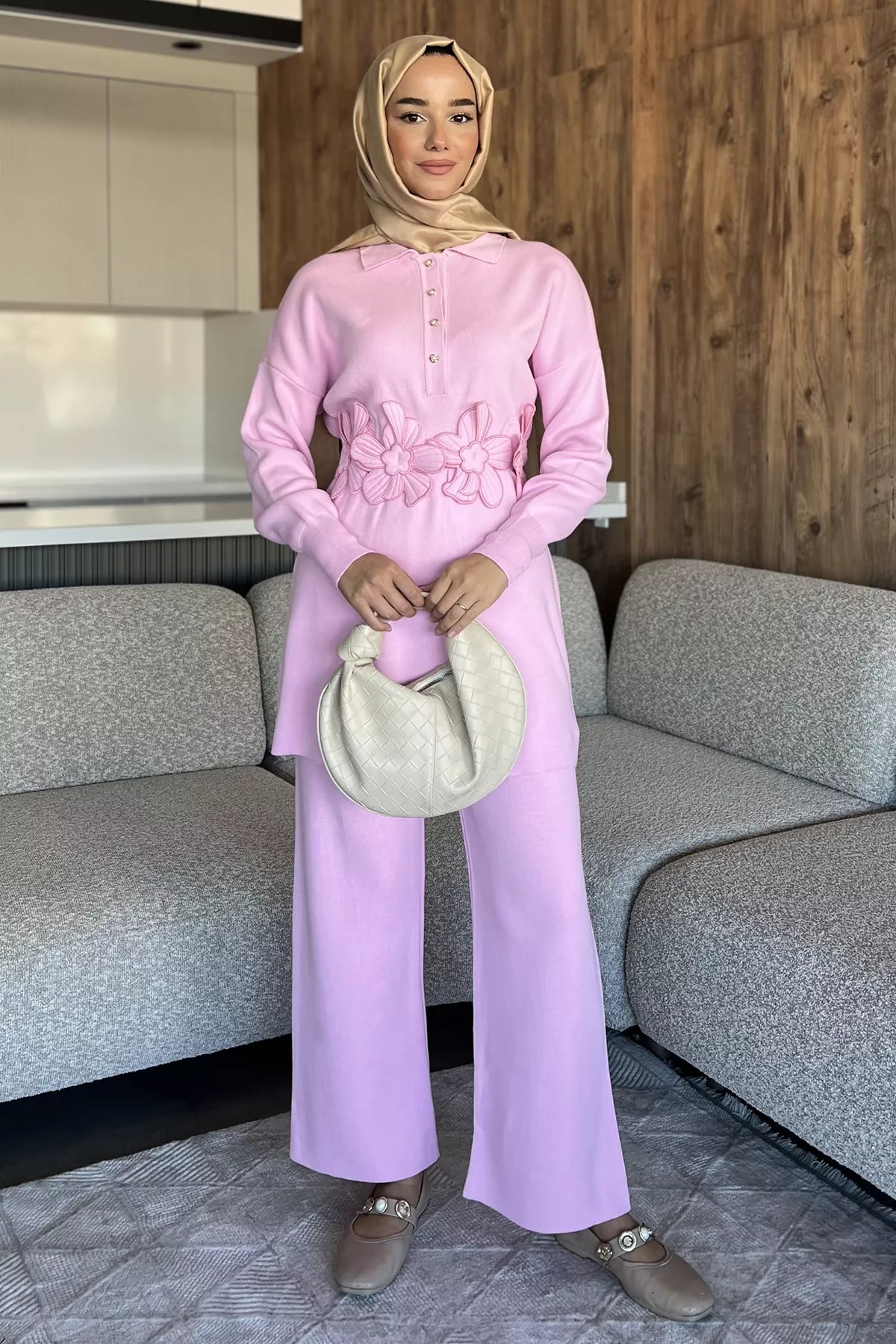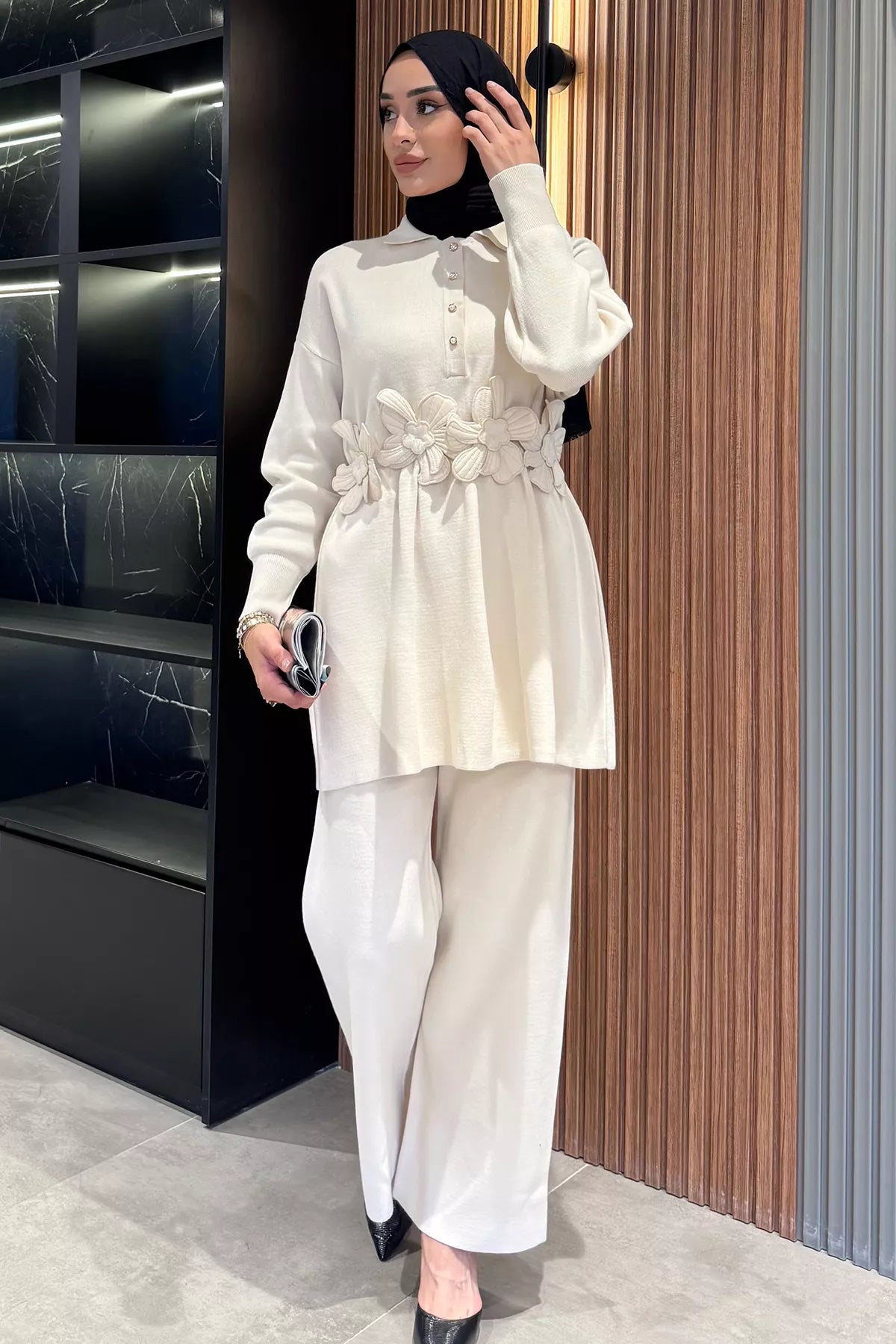 Papatya Aplikeli Tunik Pantolon Triko Tesettür İkili Takım