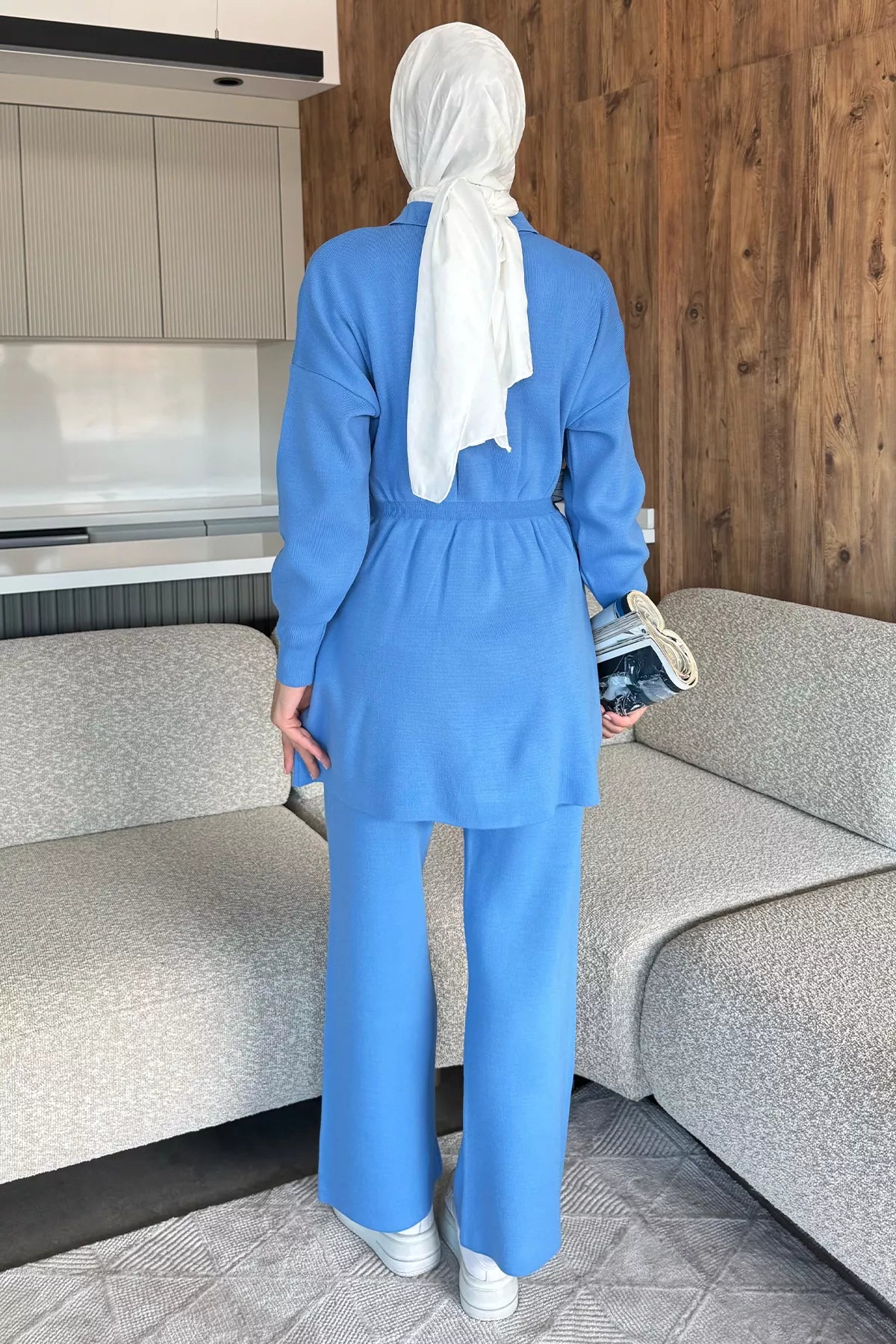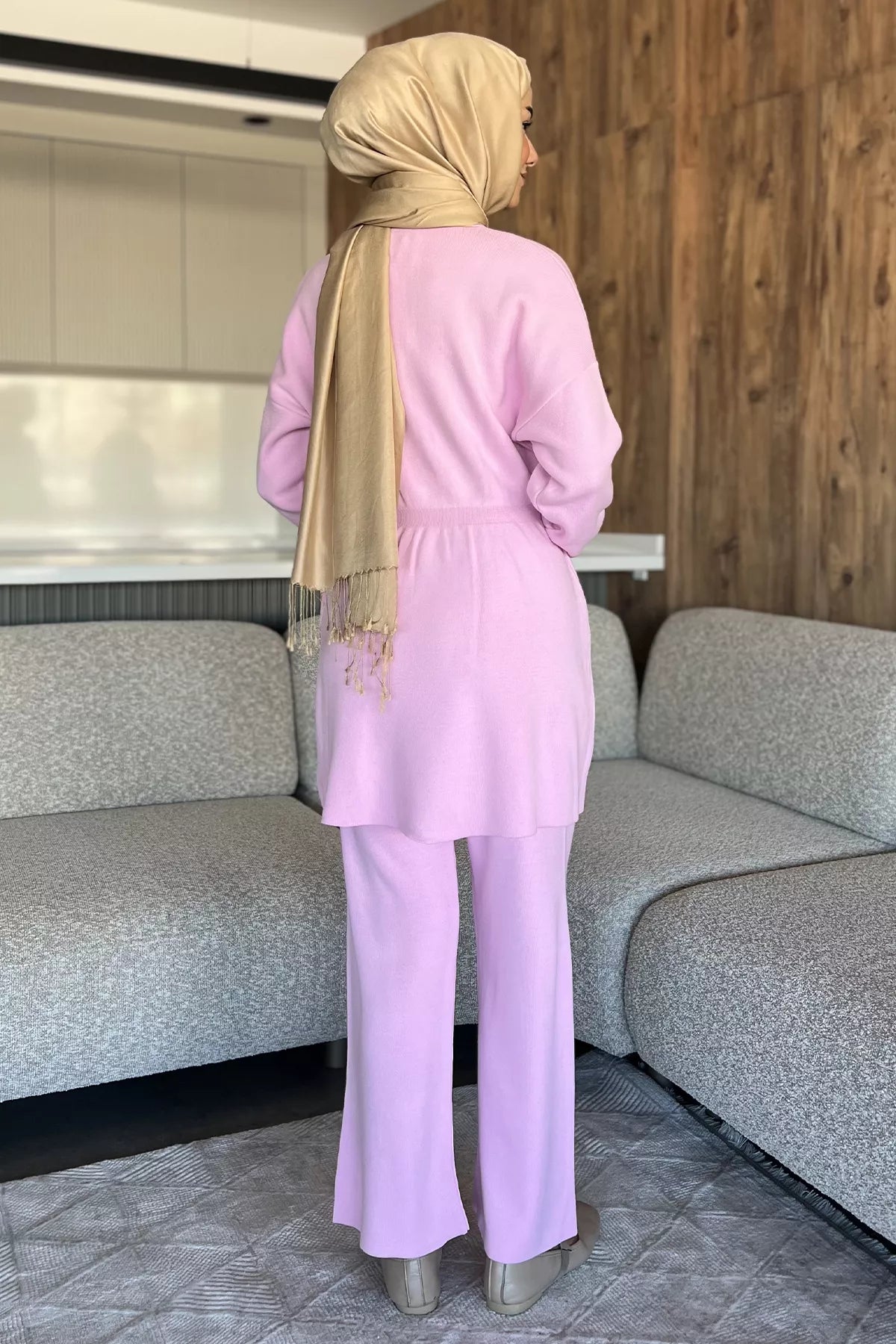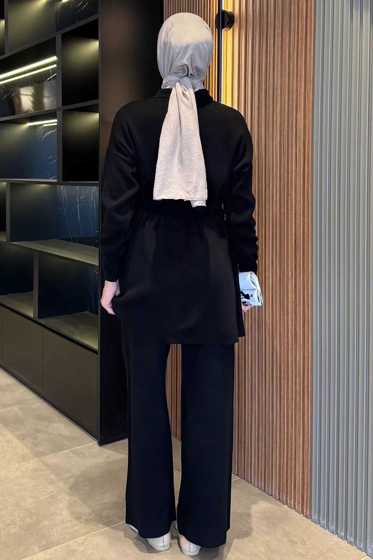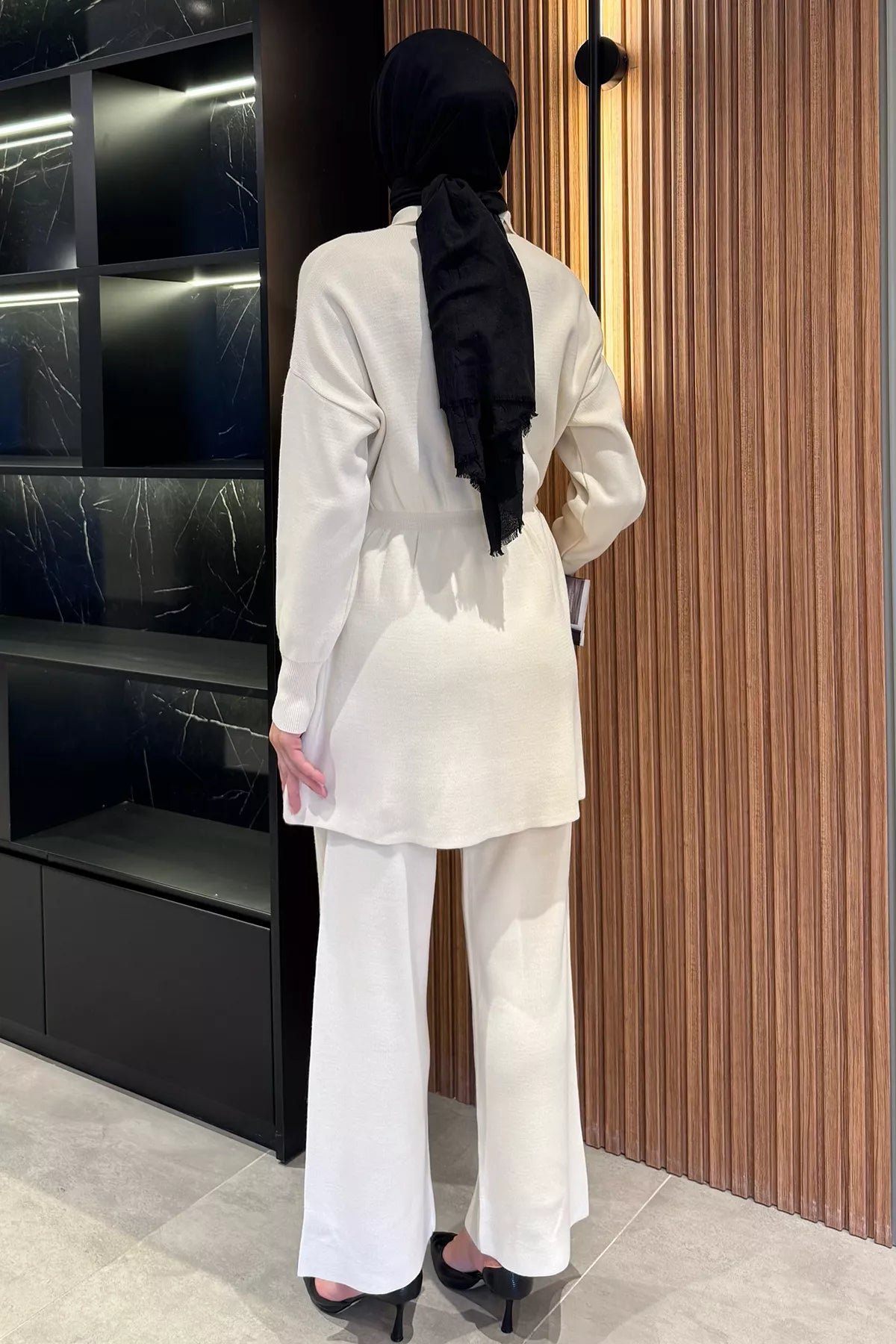 Rahat kesimli pantolon ise özgürce hareket etme imkânı sunarken, dökümlü yapısıyla zarif bir siluet oluşturuyor. Triko kumaşın yumuşak dokusu hem konfor hem de şıklık sağlarken, mevsim geçişlerinde de rahatlıkla kullanılabiliyor. Günlük hayatta rahat kombinler yapmak isteyenlerden, özel davetlerde zarif bir duruş yakalamak isteyenlere kadar geniş bir kullanım alanı sunar.