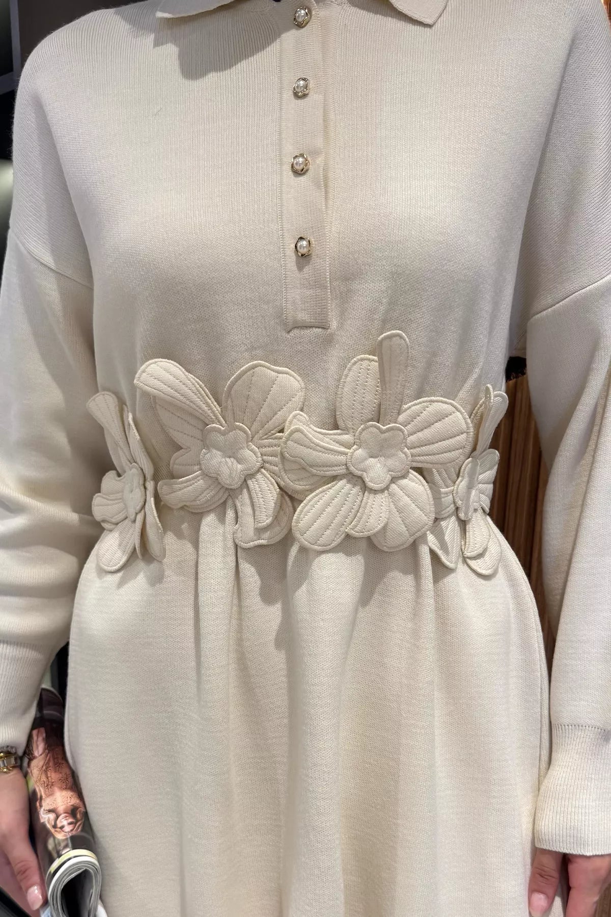 Zarif detaylarıyla öne çıkan papatya aplikeli tunik pantolon triko tesettür ikili takım, modern ve şık bir görünüm sunuyor. Tuniğin bel kısmında yer alan papatya aplikeleri romantik ve feminen bir dokunuş katarken, tunik boyunun uzun yapısı tesettür giyime uyumlu bir kullanım sağlıyor. Düğme detayıyla zenginleştirilen üst parça, klasik şıklığı modern bir tarzla buluşturuyor.