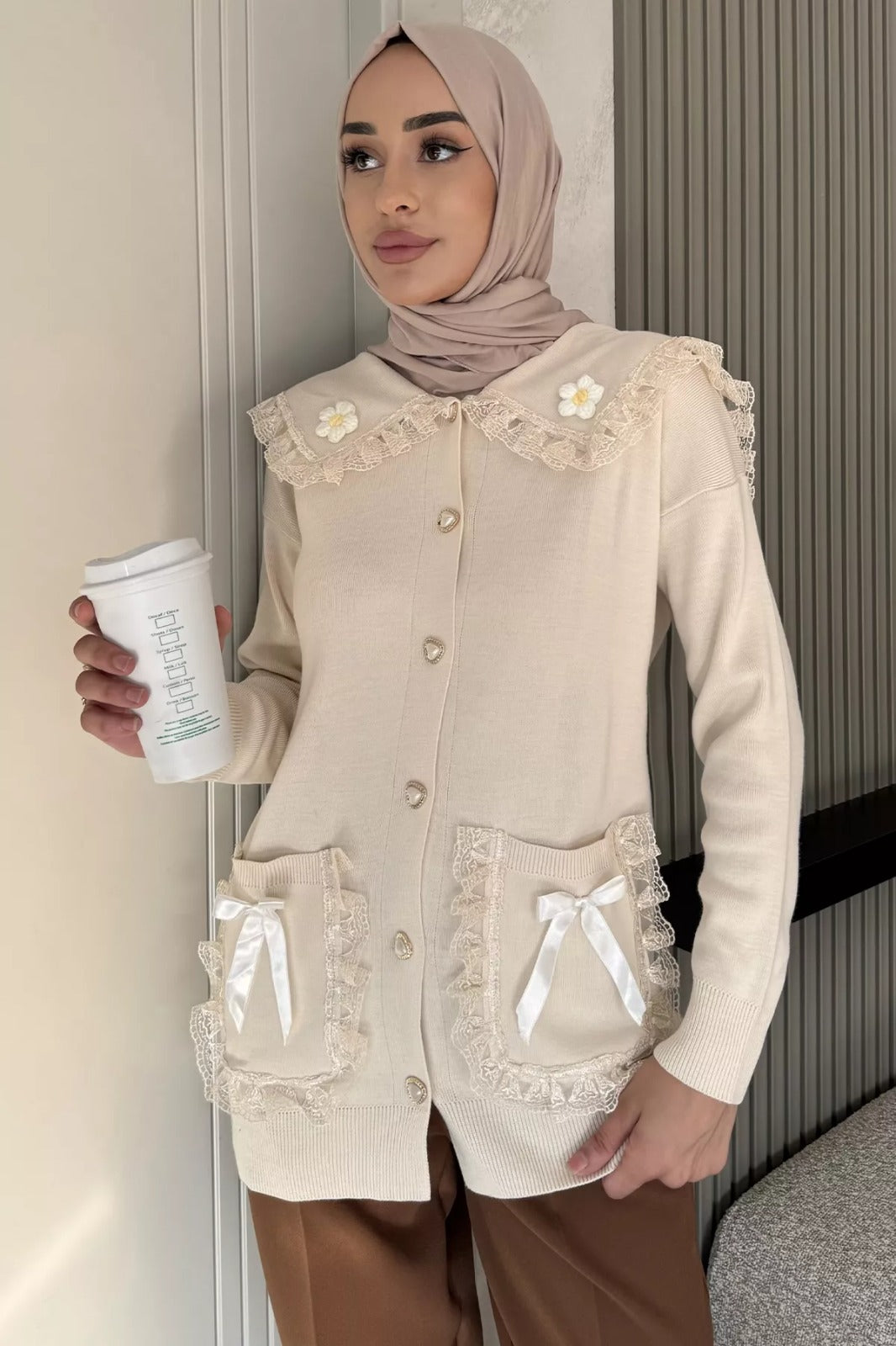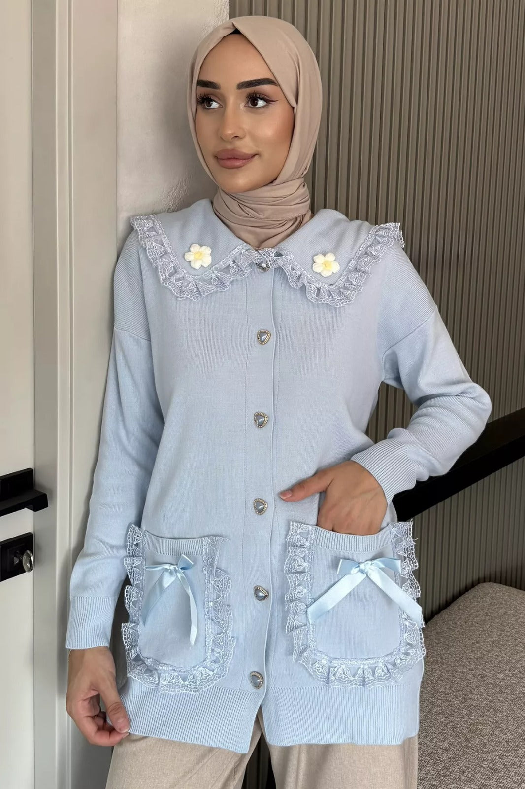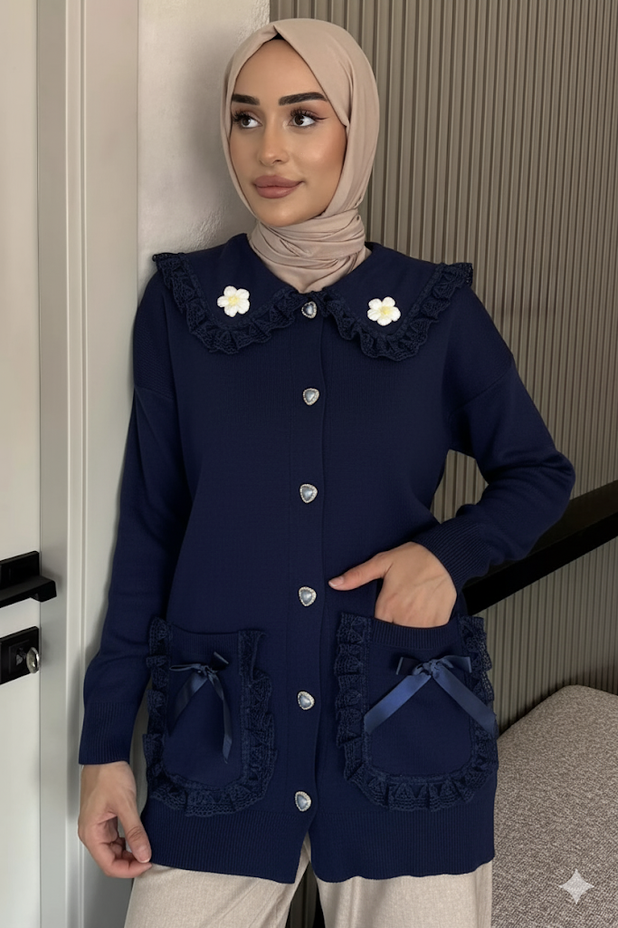 Romantik detaylarıyla öne çıkan bu tesettür triko hırka, zarif dantel fırfırlı yakası ve papatya figürleriyle feminen bir şıklık sunuyor. Ön kısmında yer alan dantel işlemeli cepler ve kurdele detayları ürüne nostaljik ve zarif bir hava katıyor.