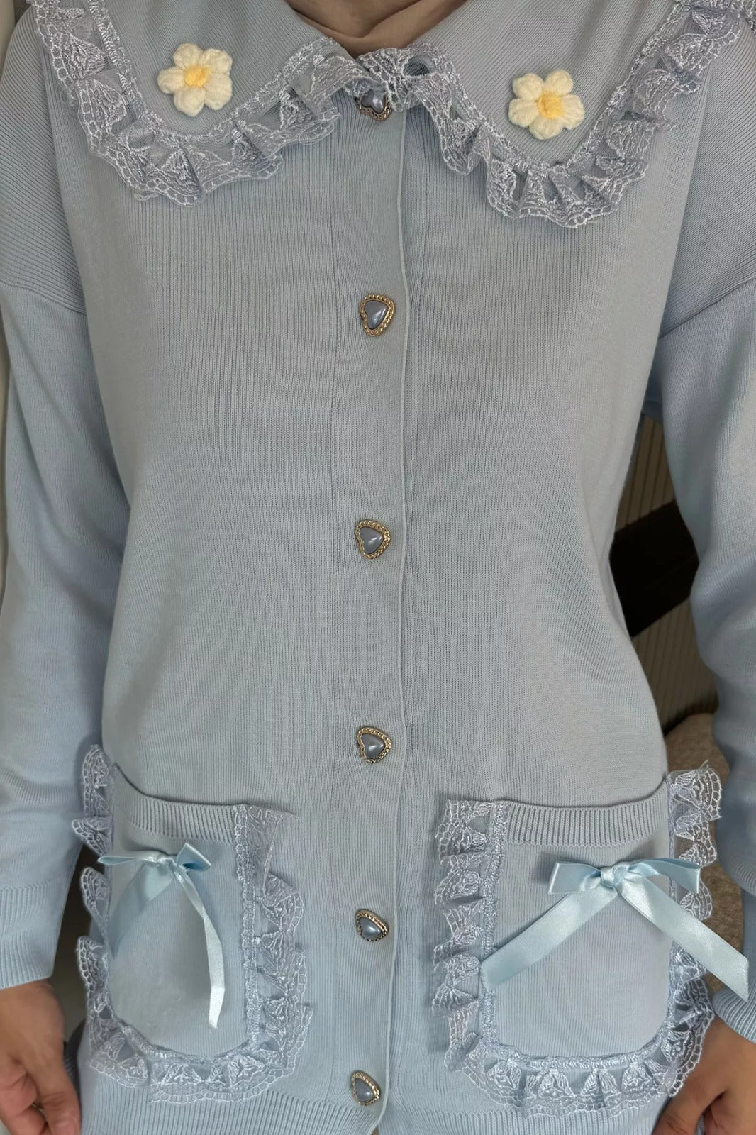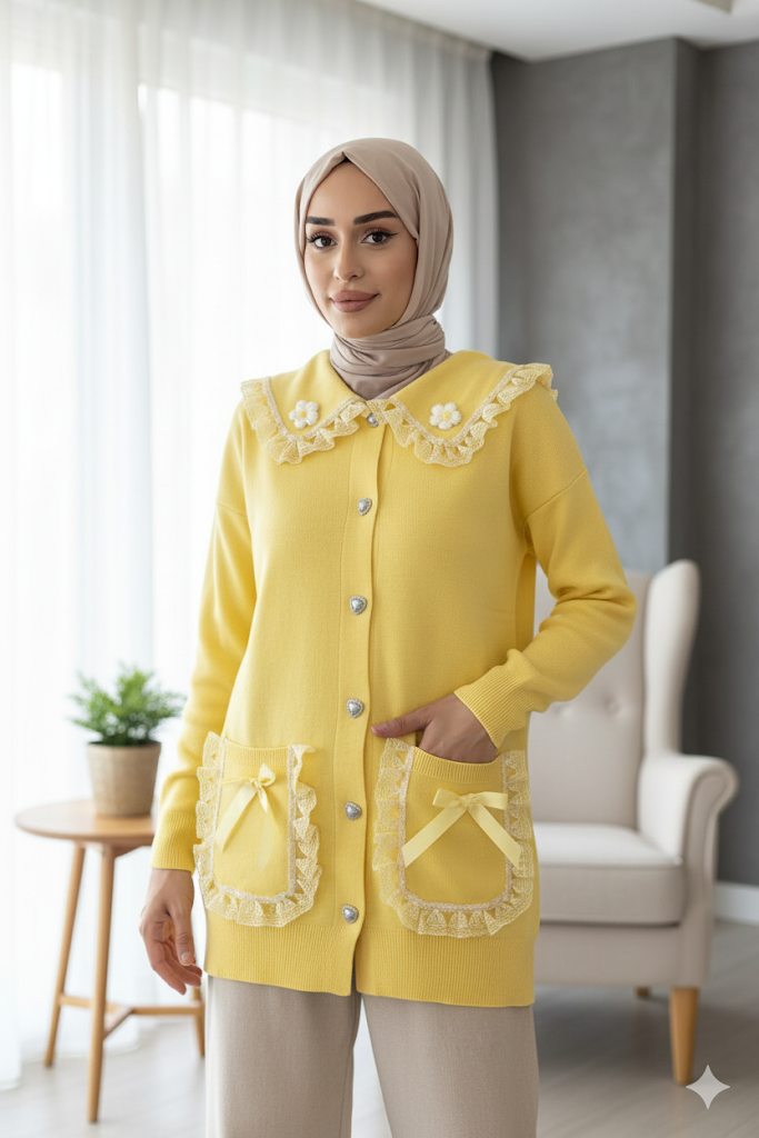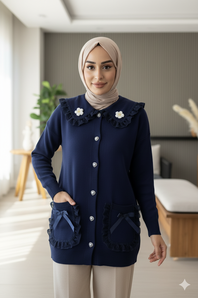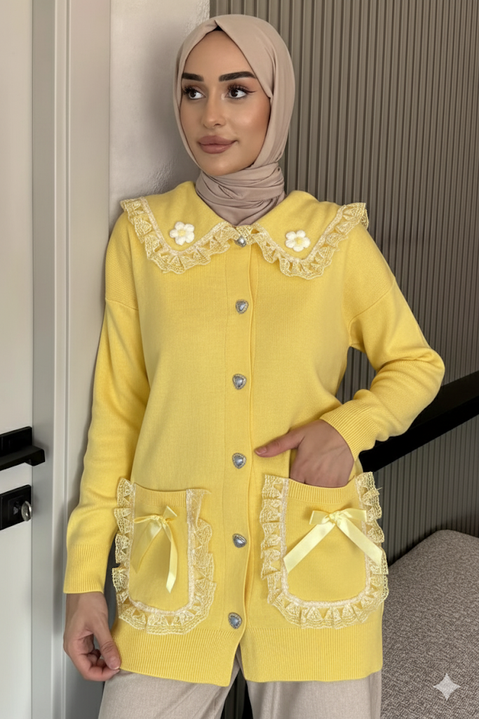 Romantik detaylarıyla öne çıkan bu tesettür triko hırka, zarif dantel fırfırlı yakası ve papatya figürleriyle feminen bir şıklık sunuyor. Ön kısmında yer alan dantel işlemeli cepler ve kurdele detayları ürüne nostaljik ve zarif bir hava katıyor.