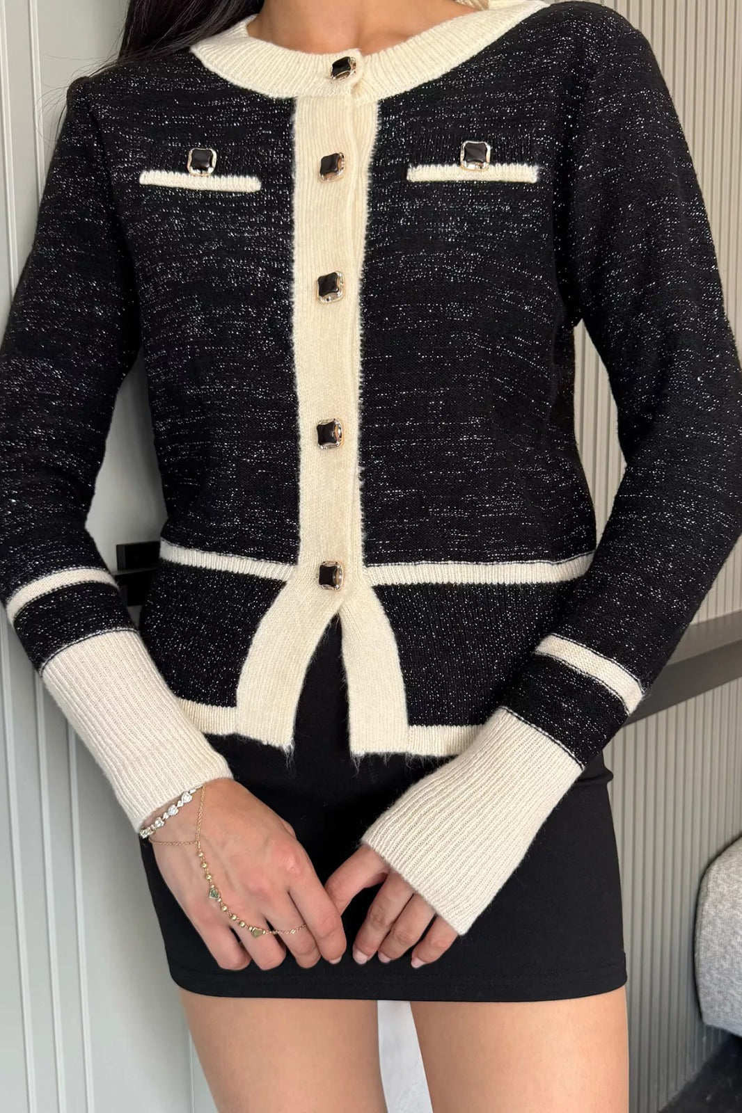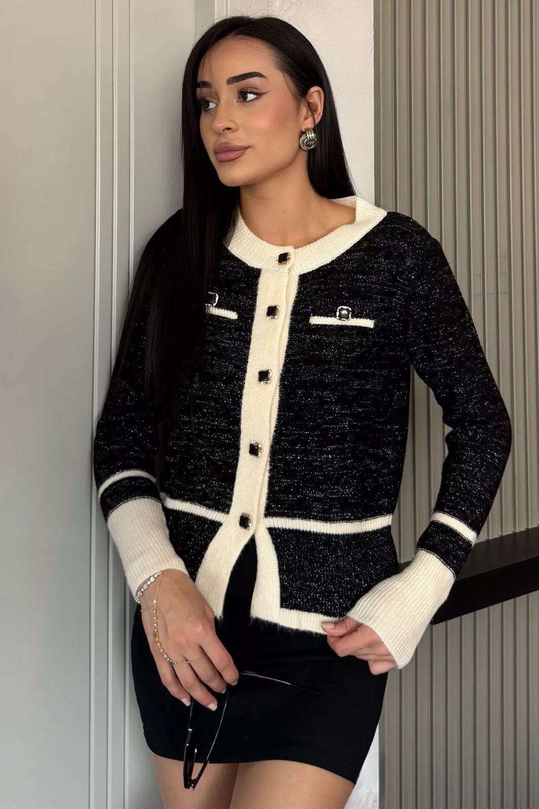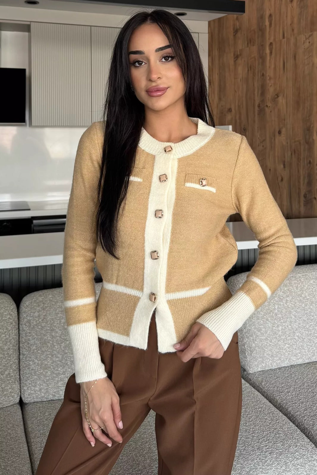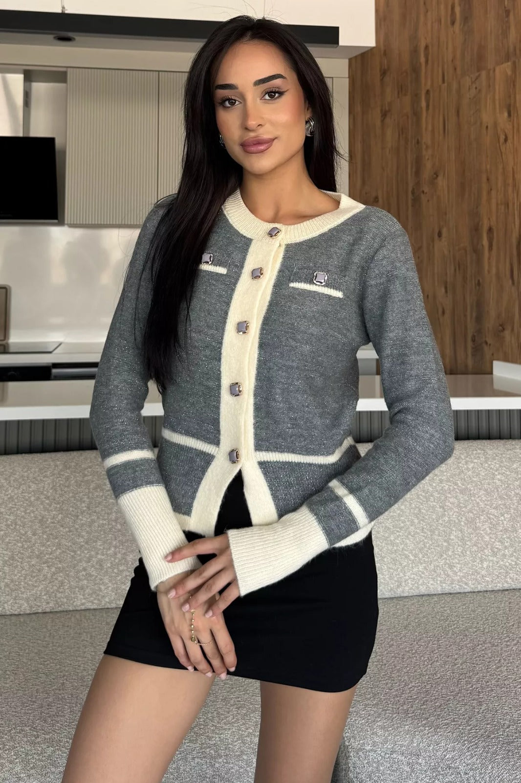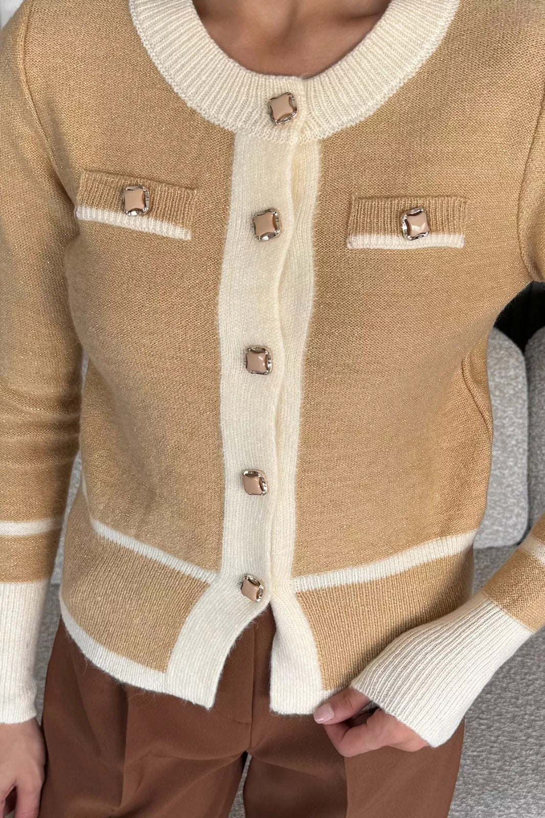 Zarif tasarımı ve modern detaylarıyla öne çıkan sahte cepli triko hırka, hem günlük kullanım hem de özel anlar için şık bir seçenek sunuyor. Önde yer alan dekoratif cepler, tasarıma sofistike bir hava katarken, düğme detaylarıyla klasik ve modern tarzı buluşturuyor. Yuvarlak yaka kesimi sayesinde sade bir şıklık sunan hırka, vücuda oturan formuyla zarif bir görünüm kazandırıyor.
