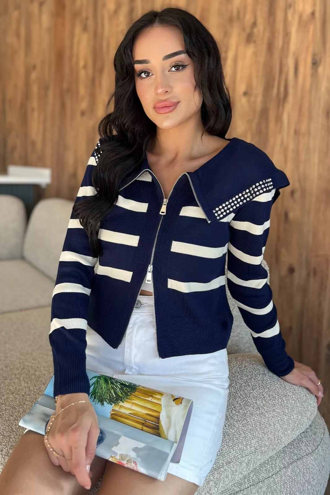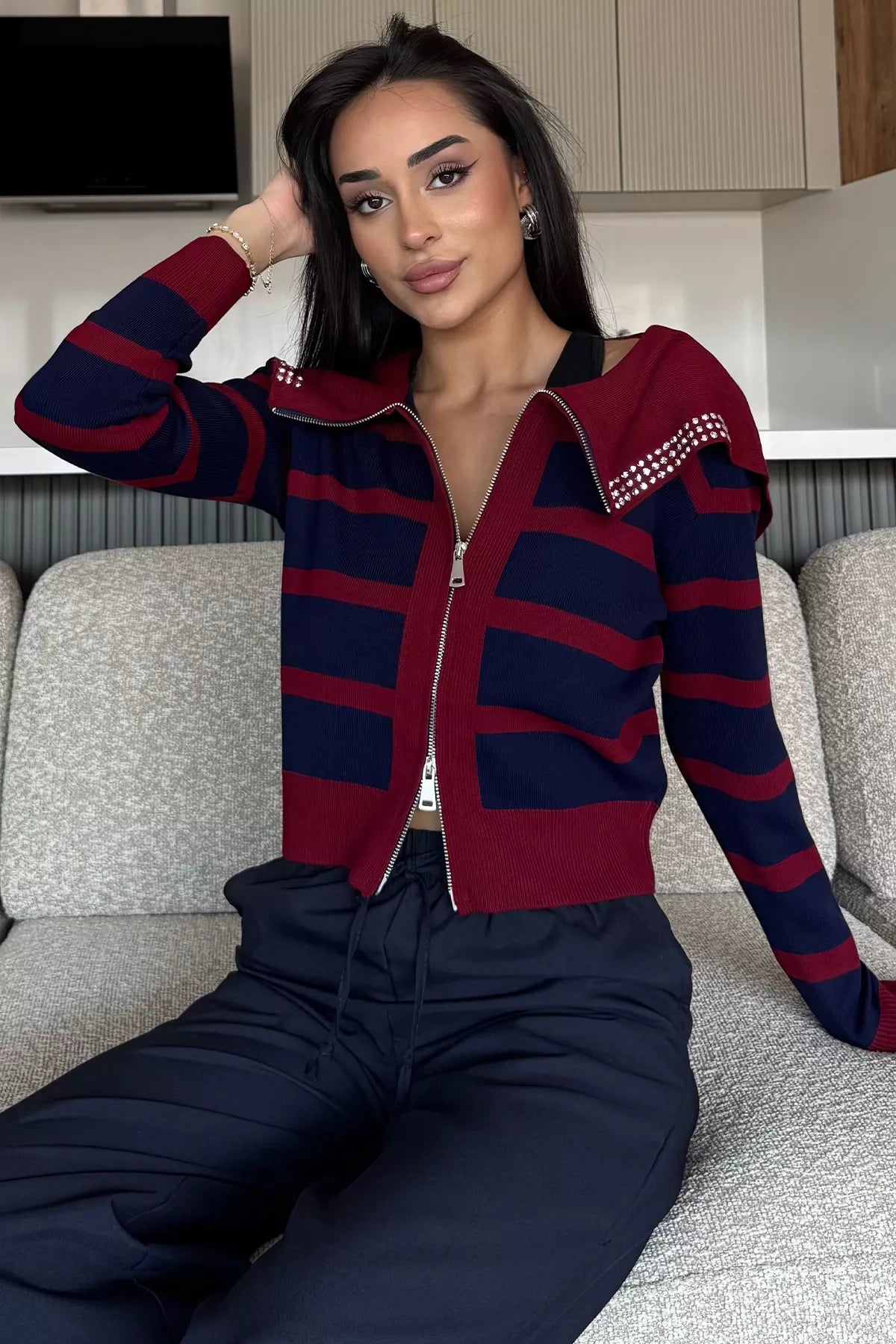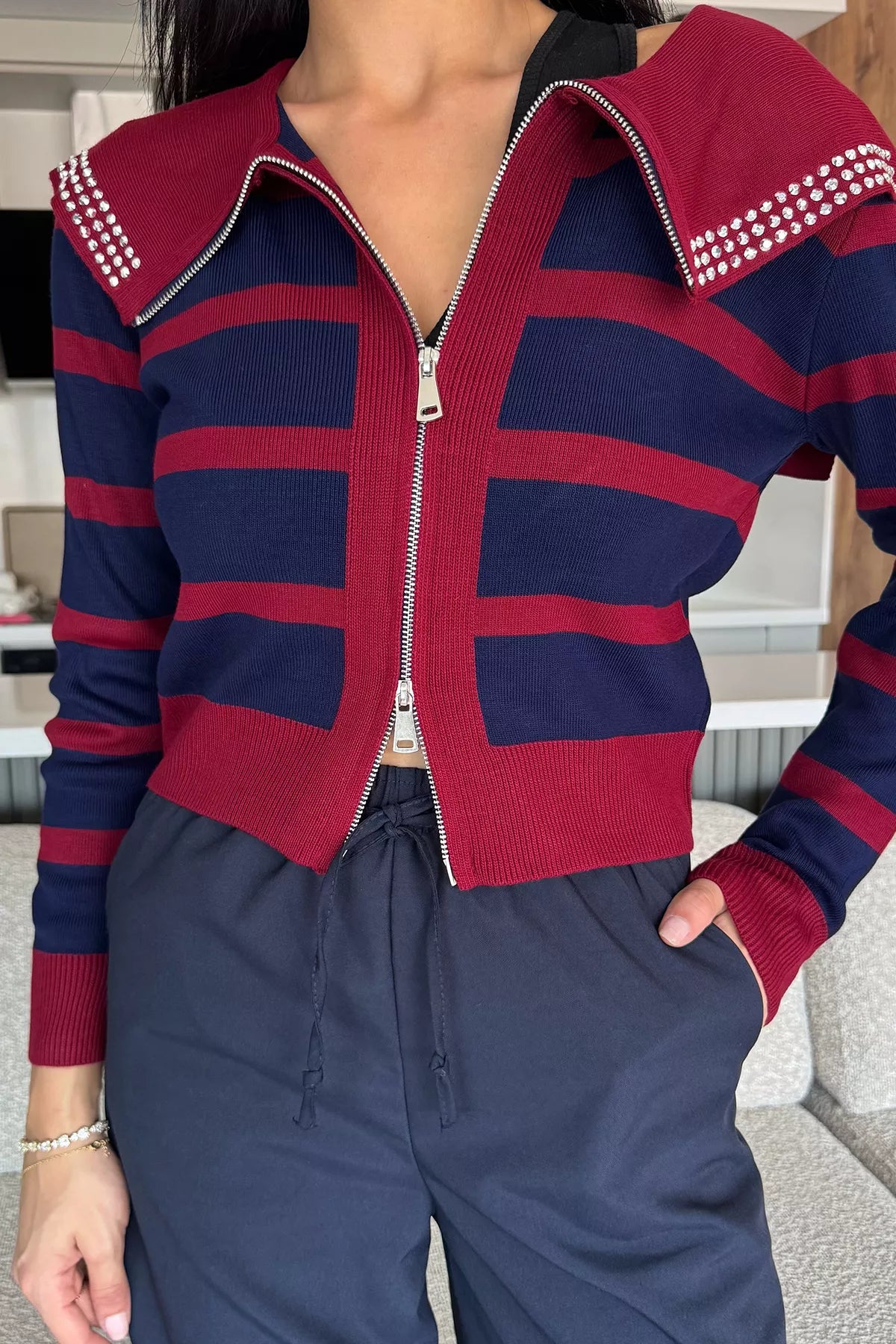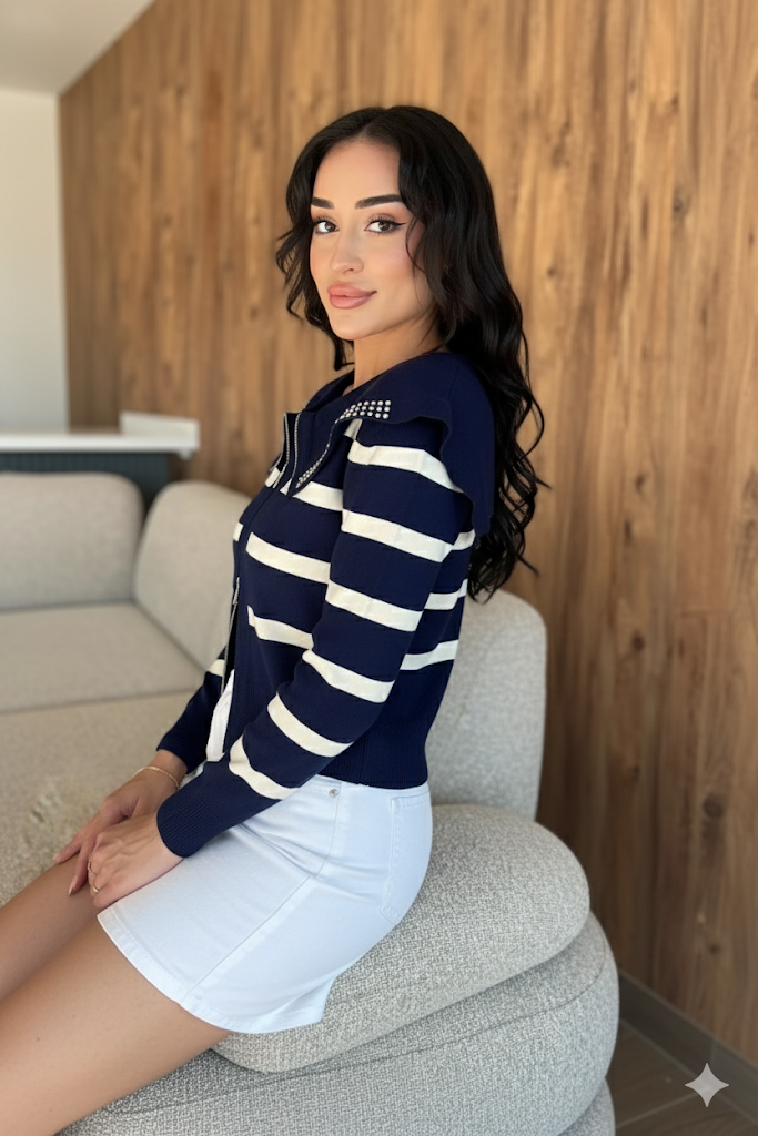 Modern ve şık tasarımıyla öne çıkan yaka detaylı çizgili triko hırka, rahatlığı ve zarafeti bir araya getiriyor. Fermuarlı ön kapama detayıyla pratik bir kullanım sunarken, çizgili deseni dinamizm ve enerjik bir stil yansıtıyor. Geniş yakasında yer alan taş işlemeli detay ise hırkaya göz alıcı bir şıklık katıyor.