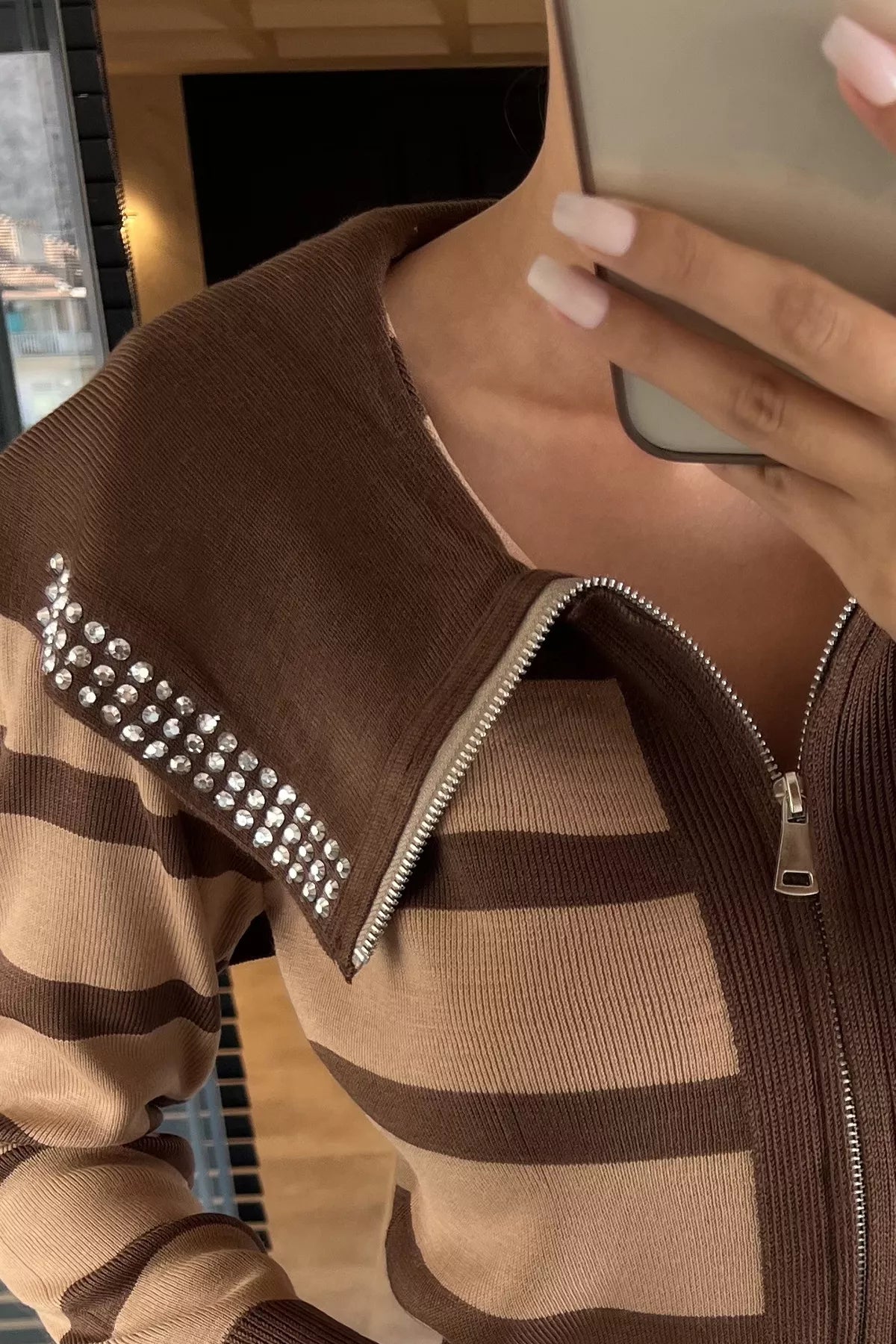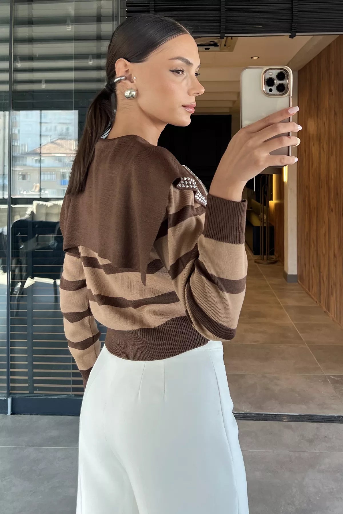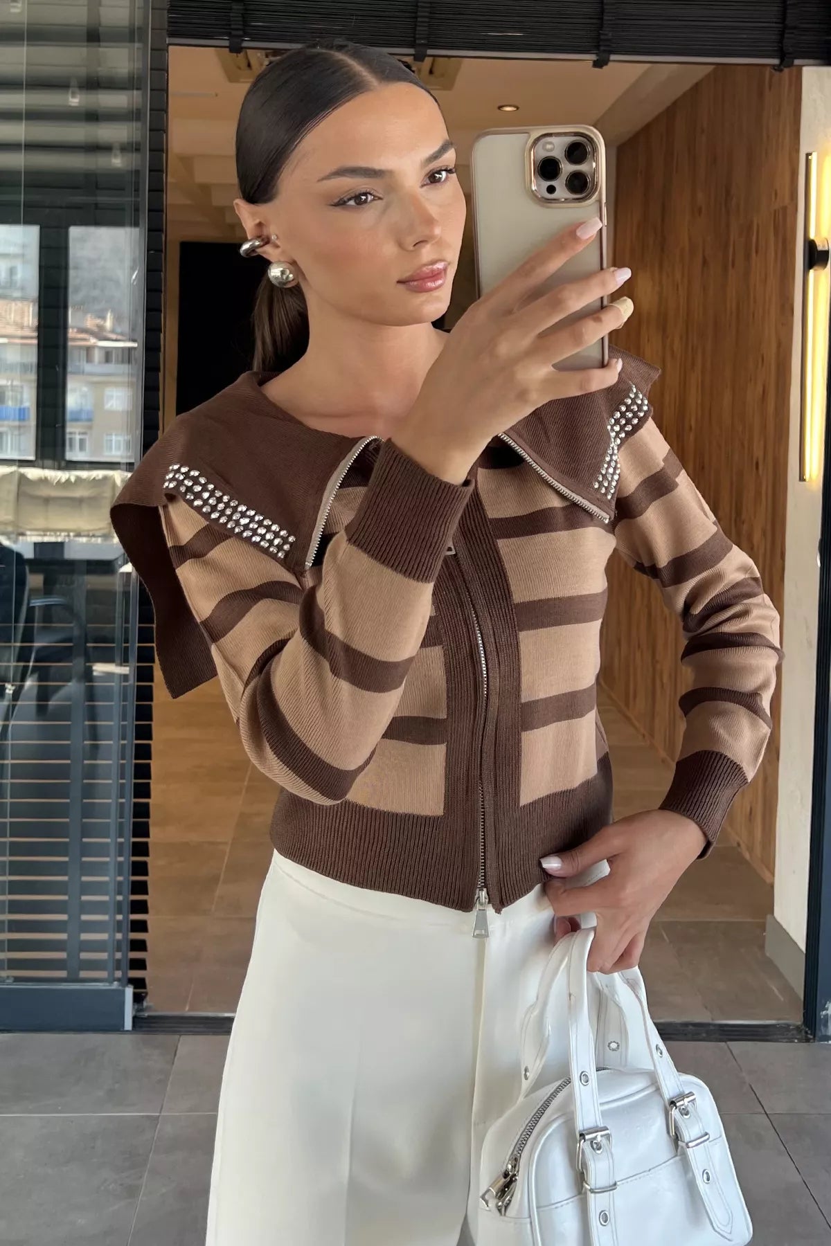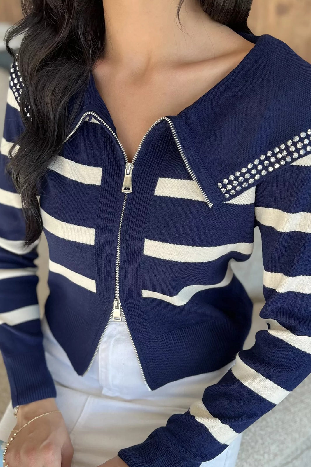Modern ve şık tasarımıyla öne çıkan yaka detaylı çizgili triko hırka, rahatlığı ve zarafeti bir araya getiriyor. Fermuarlı ön kapama detayıyla pratik bir kullanım sunarken, çizgili deseni dinamizm ve enerjik bir stil yansıtıyor. Geniş yakasında yer alan taş işlemeli detay ise hırkaya göz alıcı bir şıklık katıyor.